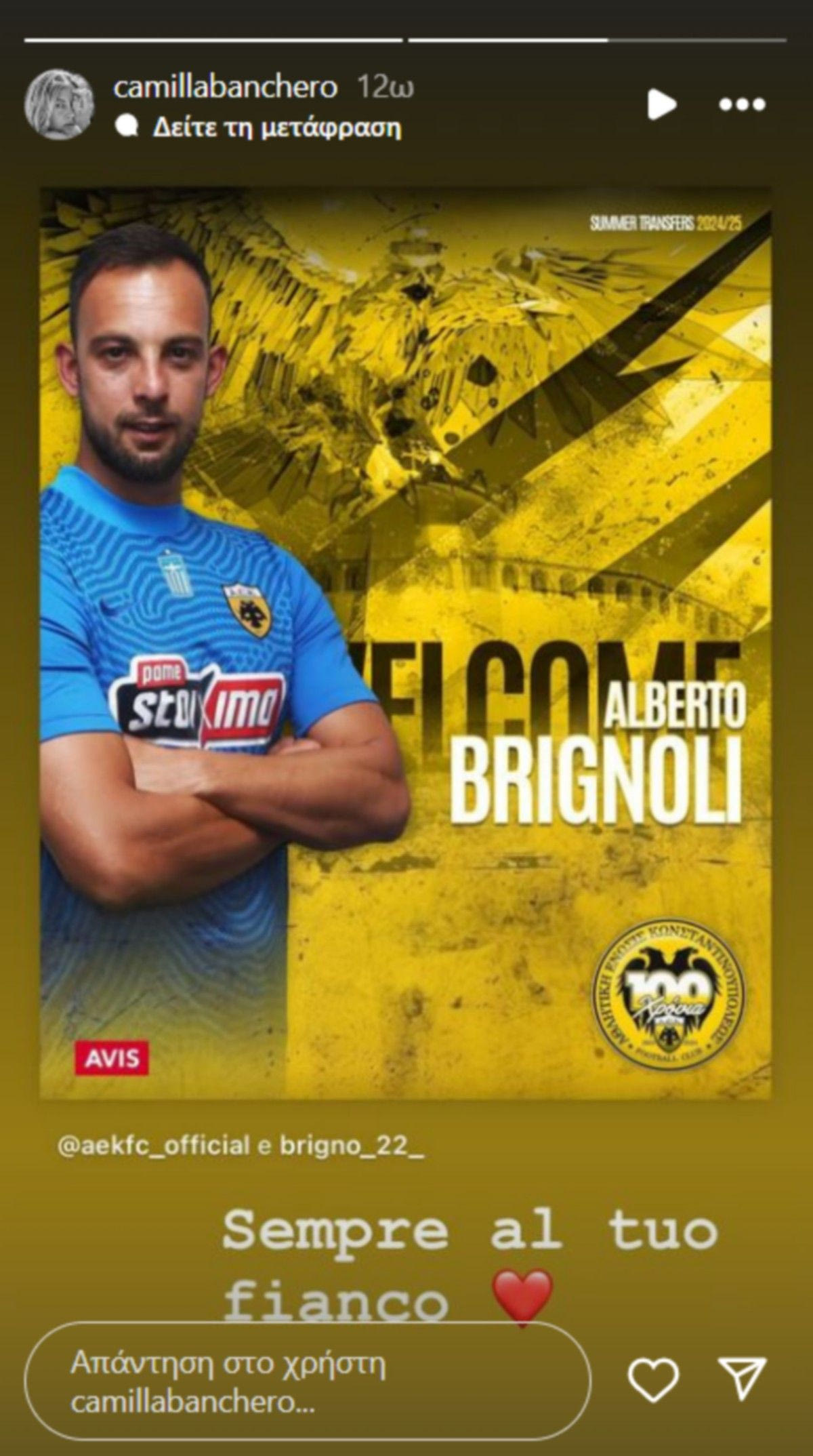 Ο Αλμπέρτο Μπρινιόλι έχει τη στήριξη της συζύγου του, Καμίλα, μετά την ανακοίνωσή του από την ΑΕΚ.