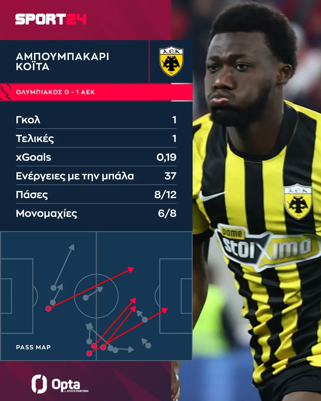 Μάλιστα, ο Κοϊτά σκόραρε στη μοναδική τελική του στον αγώνα, η οποία αξιολογήθηκε με 0,19 xGoals, με την εκτέλεσή του όμως να είναι σχεδόν άπιαστη, αφού μετρήθηκε με 0,80 xGOT.