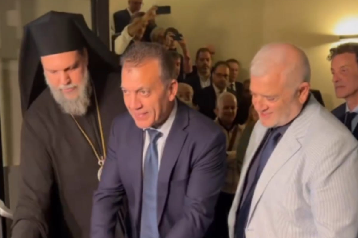 Ο Αναπληρωτής Υπουργός Αθλητισμού, Γιάννη Βρούτσης, έκοψε την κορδέλα στα εγκαίνια συνοδευόμενος από τον Δημήτρη Μελισσανίδη και τον Μητροπολίτη Νέας Φιλαδέλφειας, Γαβριήλ.