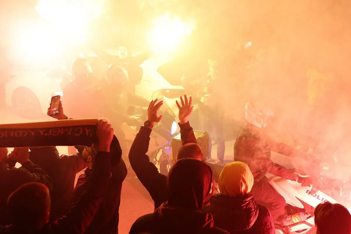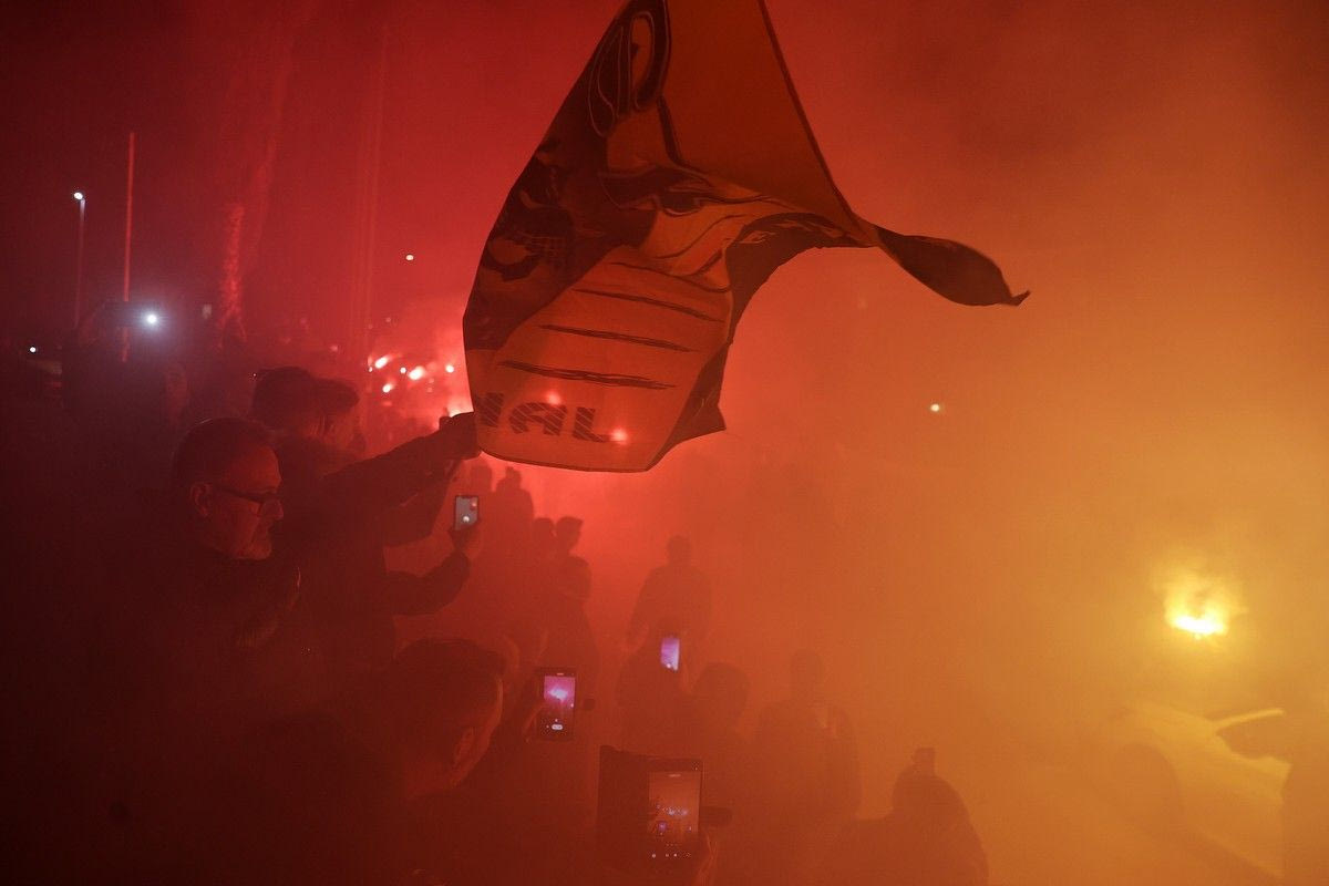 Εκατοντάδες φίλαθλοι της ΑΕΚ περίμεναν από νωρίς με υπομονή την αποστολή της ομάδας έξω από το ξενοδοχείο και μόλις το πούλμαν έκανε την εμφάνιση του έκαναν τη νύχτα ημέρα.
