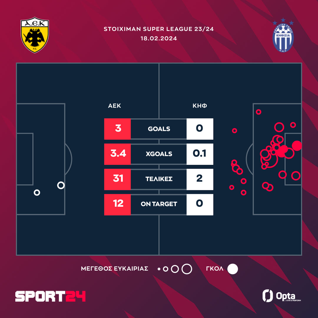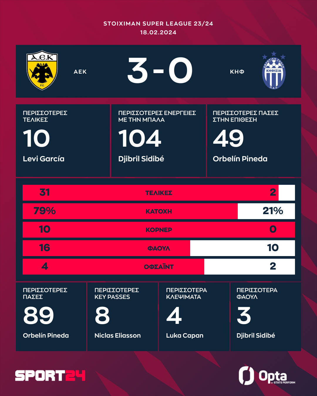 Η ΑΕΚ δεν δυσκολεύτηκε κόντρα στην Κηφισιά, καθώς επικράτησε 3-0 στην OPAP Arena με σκόρερ τον Λιβάι Γκαρσία και τον Ρόμπερτ Λιούμπιτσιτς για την 23η αγωνιστική της Stoiximan Super League. Οι φιλοξενούμενοι έπαιζαν με παίκτη λιγότερο από το 4′ λόγω της αποβολής του Σπίνου και δεν μπόρεσε να αντισταθεί στις επιθετικές ορέξης της ΑΕΚ.