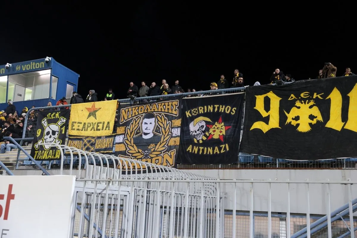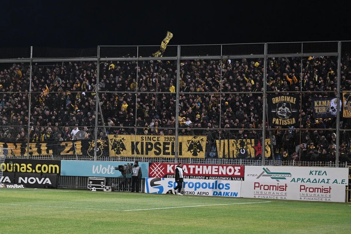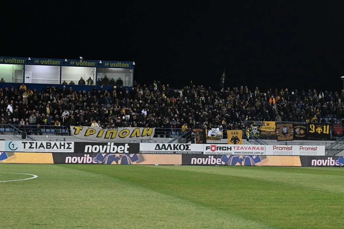 Οι φίλοι της ΑΕΚ πήραν θέση στις εξέδρες του Θεόδωρος Κολοκοτρώνης για το ματς με τον Αστέρα AKTOR και έδωσαν έντονο κίτρινο χρώμα στις εξέδρες.