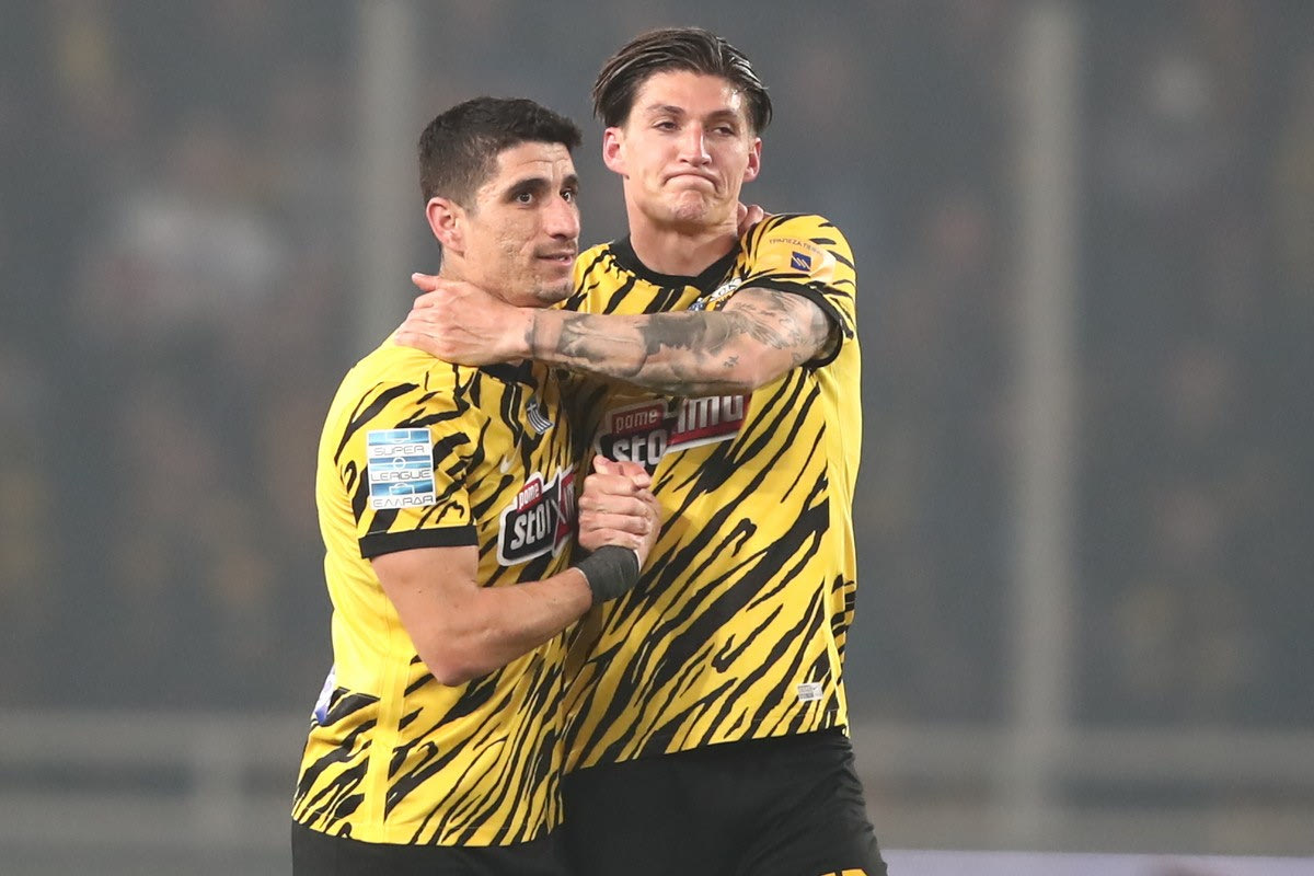 Οι Τσούμπερ - Μάνταλος πανηγυρίζουν μετά τη νίκη της ΑΕΚ επί του Άρη | 10 Απριλίου 2023