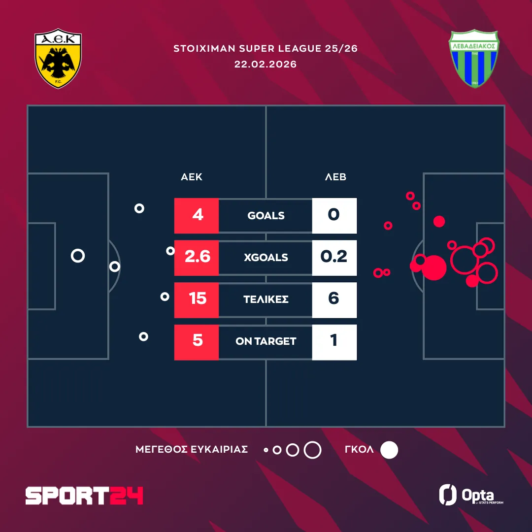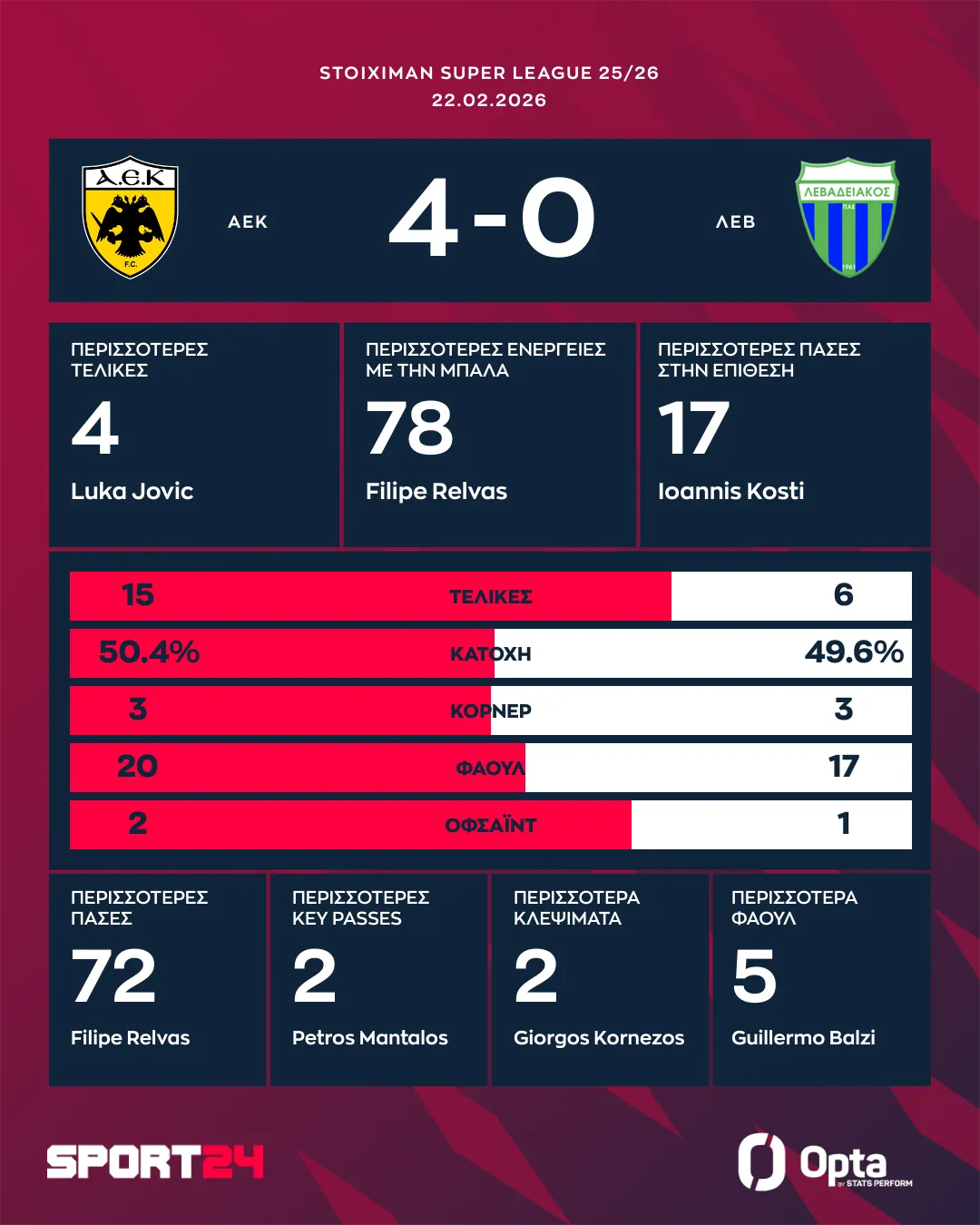 Η ΑΕΚ ήταν επιβλητική και επέστρεψε στην κορυφή της Stoiximan Super League. Η Ένωση παρουσίασε μία καταιγιστική εικόνα και επικράτησε 4-0 του Λεβαδειακού στην Allwyn Arena για την 22η αγωνιστική του πρωταθλήματος.