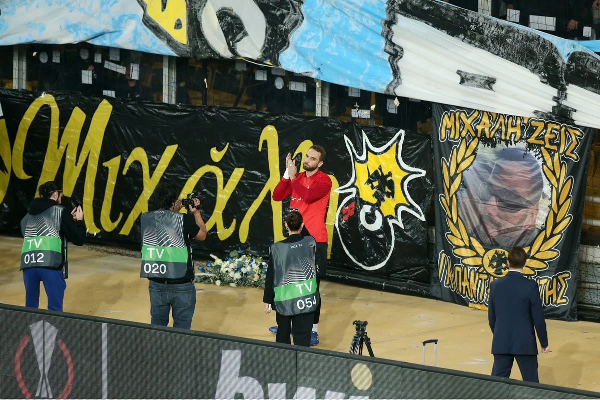 Ο τερματοφύλακας της Μαρσέιγ, Πάου Λόπεθ, άφησε στεφάνι λουλούδια στη μνήμη του Μιχάλη Κατσούρη, μπροστά από το πανό που έχουν οι φίλοι της ΑΕΚ στην OPAP Arena.
