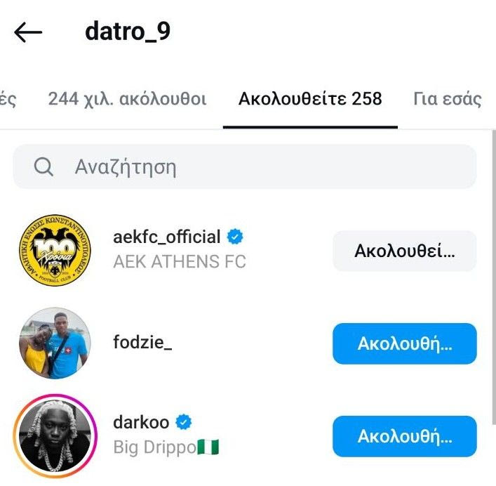 Ο 21χρονος Ιβοριανός επιθετικός, Νταβίντ Ντατρό Φοφανά ακολουθεί την ΑΕΚ στον λογαριασμό της στο Instagram.