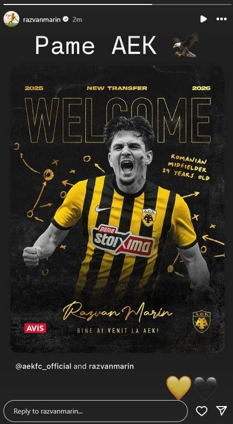 Η ΑΕΚ ολοκλήρωσε τη μεταγραφή του Ραζβάν Μαρίν και ο Ρουμάνος προχώρησε στην πρώτη του κιτρινόμαυτη ανάρτηση στο Instagram λίγο μετά την οριστικοποίηση της μεταγραφής.