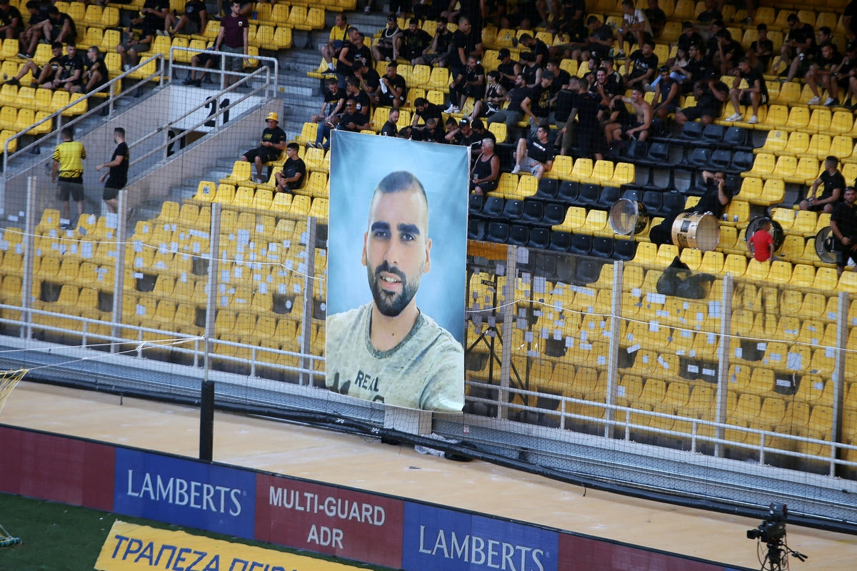 Η φωτογραφία του Μιχάλη Κατσούρη έχει τοποθετηθεί μπροστά από το πέταλο των οργανωμένων οπαδών ενόψει της αναμέτρησης της ΑΕΚ με την Ντίναμο Ζάγκρεμπ.