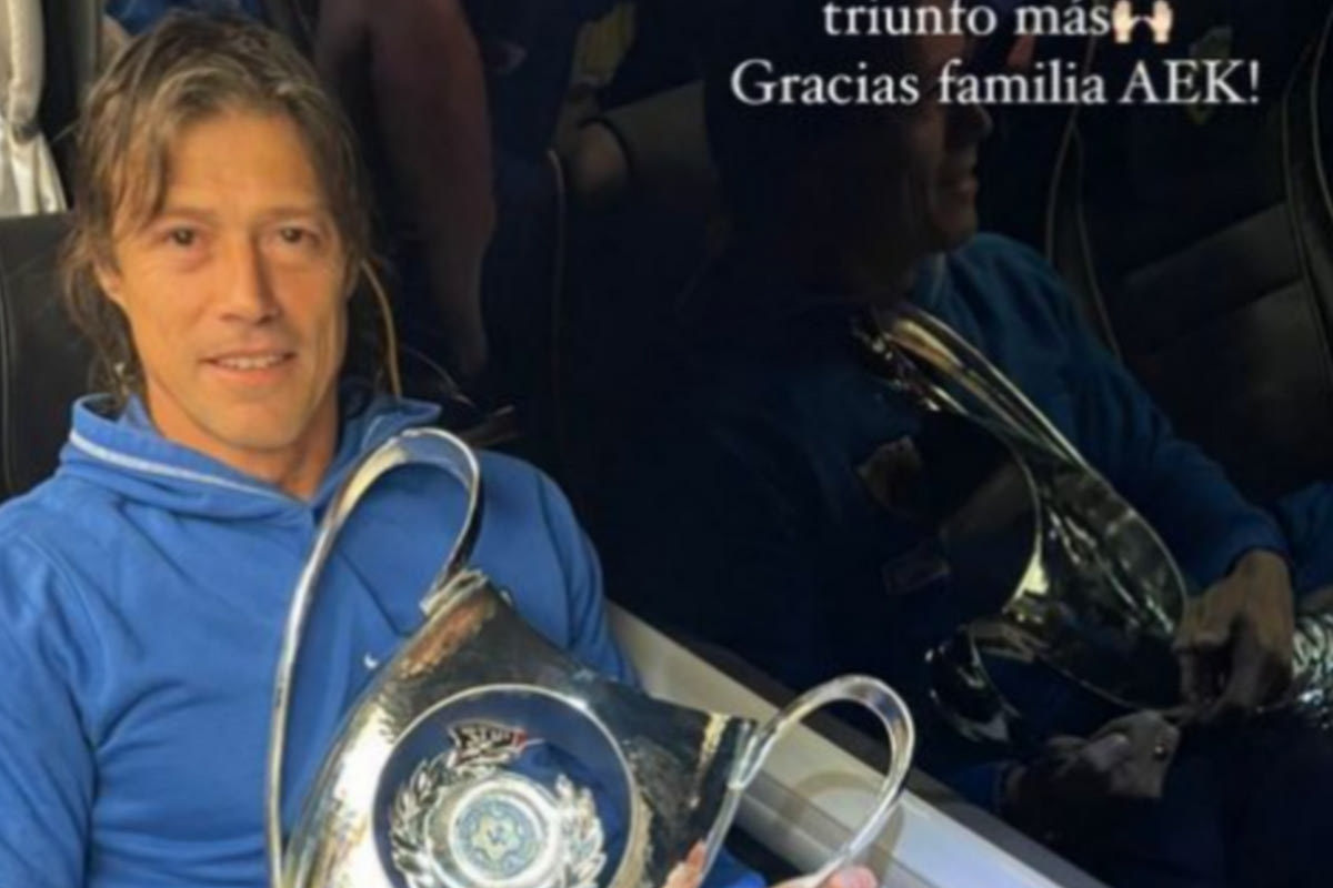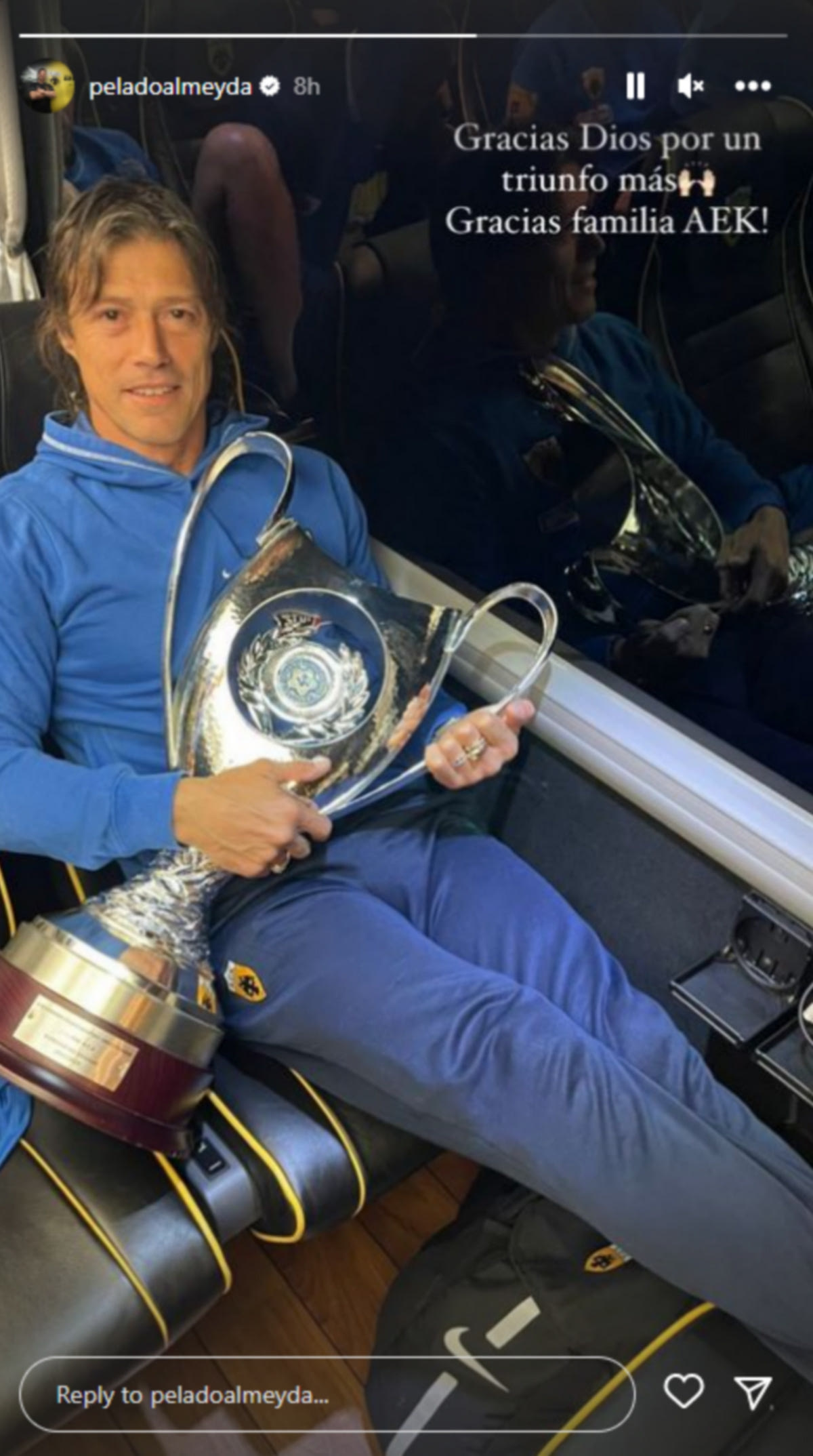 Ο Αργεντινός προπονητής ανήρτησε σε story φωτογραφία του στο instagram αγκαλιά με ο τρόπαιο του κυπελλούχου μέσα στο πούλμαν. Χαρακτηριστικά έγραφε στην δημοσίευσή του: “Ευχαριστώ, Θεέ, για έναν ακόμη θρίαμβο. Ευχαριστώ την οικογένεια της ΑΕΚ”.