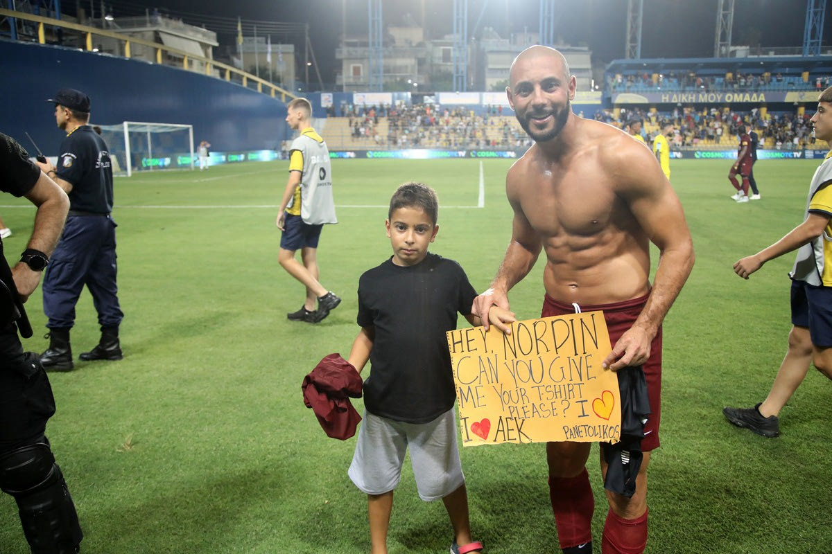 Ο Νορντίν Άμραμπατ έδωσε τη φανέλα του σε έναν μικρό φίλαθλο που είδε από κοντά την αναμέτρηση της ΑΕΚ μ ετον Παναιτωλικό στο Αγρίνιο και του ζήτησε τη φανέλα με μια πράσινη επιγραφή.