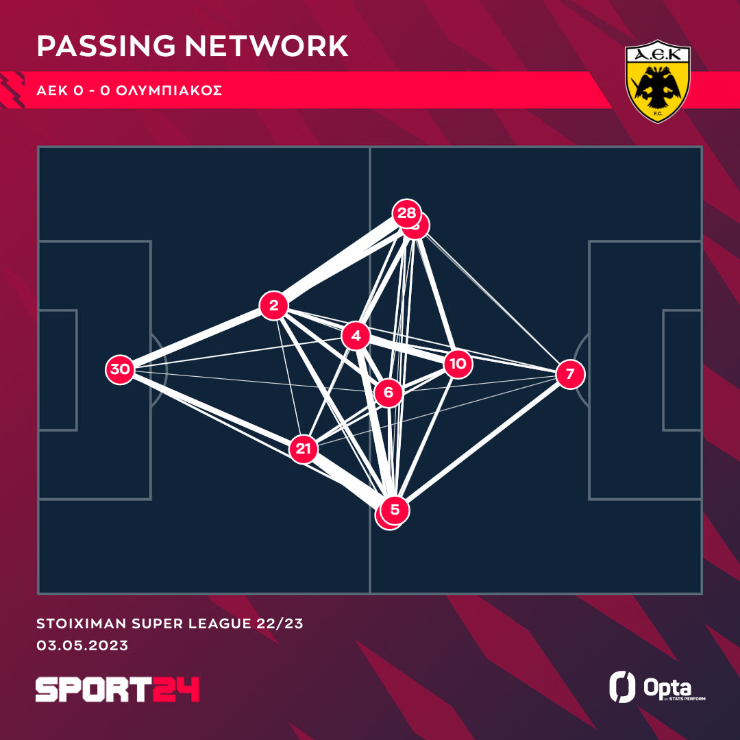 Τόσο ο Άμραμπατ όσο και ο Γκατσίνοβιτς έμειναν πιο χαμηλά στο χορτάρι και ήταν πιο κοντά στους Σιμάνσκι (4) / Γιόνσον (6), παρά στον Τσούμπερ (10) και κυρίως στον Λιβάι Γκαρσία (7), ενώ οι δύο μπακ προωθήθηκαν αρκετά. Στο γράφημα της Opta/Stats Perform μπορείτε να δείτε το δίκτυο μεταβιβάσεων και τον μέσο χώρο δράσης των κιτρινόμαυρων κόντρα στον Ολυμπιακό.