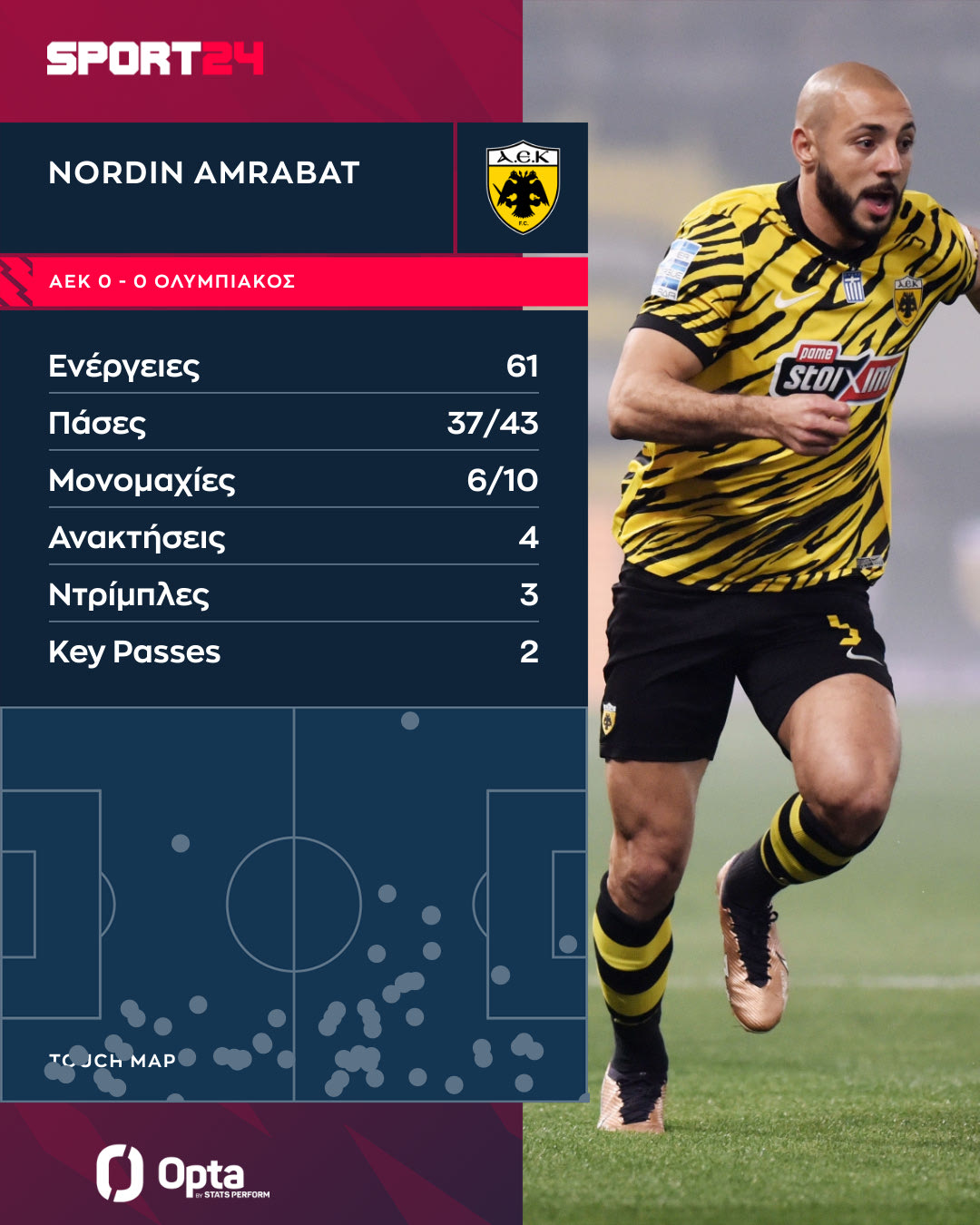 Η ΑΕΚ κυριάρχησε στο ντέρμπι με τον Ολυμπιακό, όμως στο τέλος δεν πήρε αυτό που ήθελε και πέταξε στα σκουπίδια την ευκαιρία για να σκαρφαλώσει στην κορυφή της Stoiximan Super League. Ασχέτως του αποτελέσματος η παρουσία του Άμραμπατ στο χορτάρι της OPAP Arena αξίζει κάτι παραπάνω από εύσημα, μιας και ο Μαροκινός ουσιαστικά υπηρέτησε έναν ρόλο... full-back και ξεχώρισε.