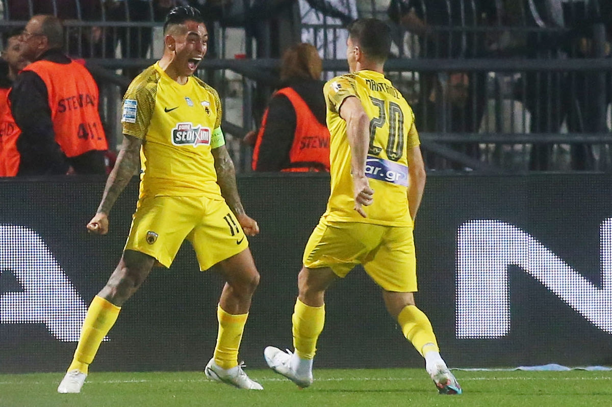 Ο Σέρχιο Αραούχο πανηγυρίζει με τον Πέτρο Μάνταλο το γκολ που πέτυχε κόντρα στον ΠΑΟΚ