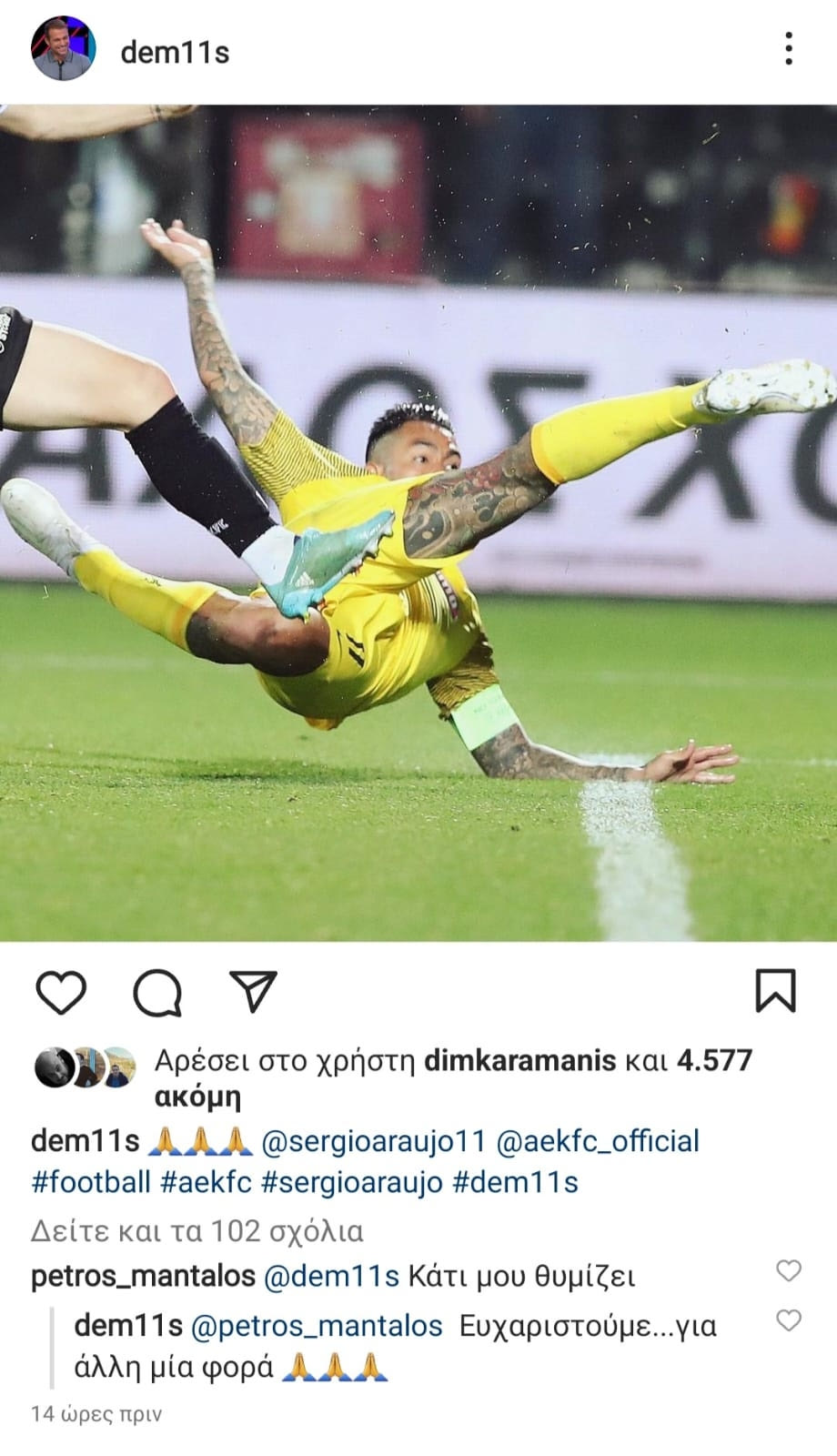 Η ΑΕΚ απέδρασε από την Τούμπα χάρη στο εξαιρετικό βολ πλανέ γκολ του Σέρχιο Αραούχο. Ο Αργεντινός επιθετικός γνώρισε την αποθέωση από μια εμβληματική μορφή της Ένωσης, τον Ντέμη Νικολαΐδη (μέσω ενός post του στο Instagram), ο οποίος στην καριέρα του με τα κιτρινόμαυρα είχε πετύχει αντίστοιχης δυσκολίας γκολ
