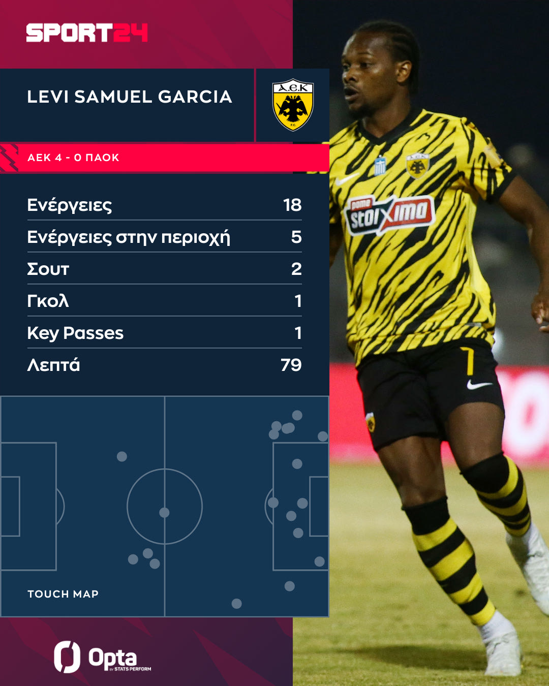 Ο Λιβάι Γκαρσία κινήθηκε πιο απομονωμένα και κατά κύριο λόγο στην περιοχή του ΠΑΟΚ ή γύρω από αυτή και παρότι δεν πραγματοποίησε μια από τις πιο μεστές εμφανίσεις του μπόρεσε να προσθέσει ένα ακόμα γκολ και να φτάσει τα 14 στη Stoiximan Super League και τρία στα playoffs σε πέντε ματς.