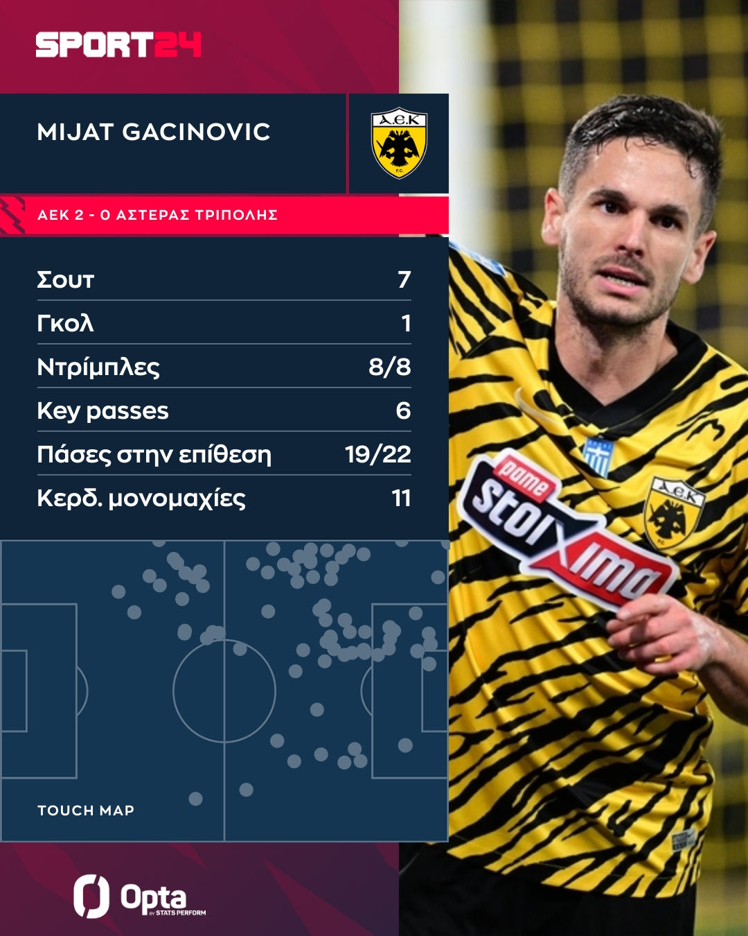 Οι ενέργειες και οι επιδόσεις του Γκατσίνοβιτς απέναντι στον Αστέρα SPORT24/STATS PERFORM