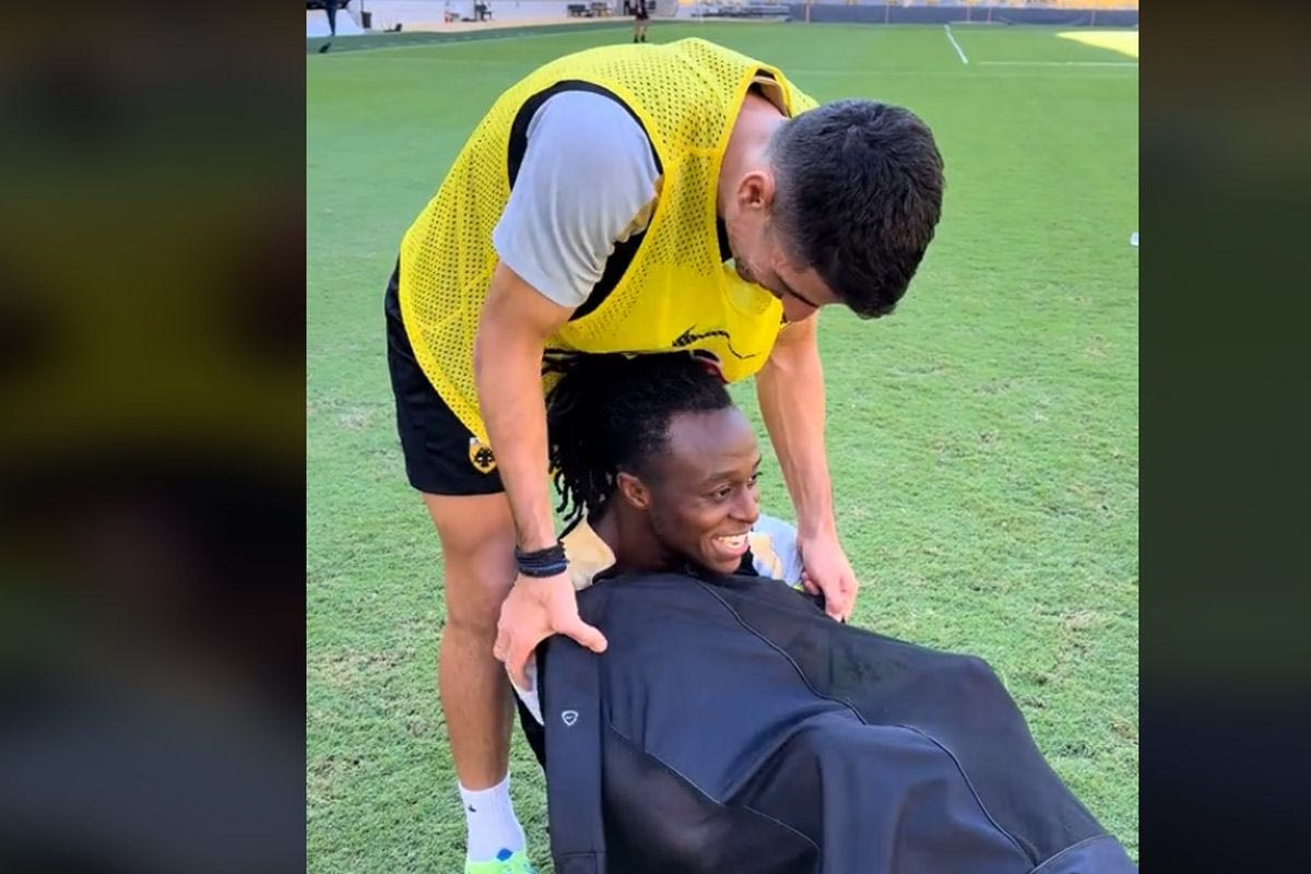 Επικό σκηνικό συνέβη στην προπόνηση της ΑΕΚ την Πέμπτη (24/10), με τον Πέτρο Μάνταλο να προσπαθεί να χωρέσει μέσα σ' έναν σάκο τον Μόουζες Οντουμπάτζο.