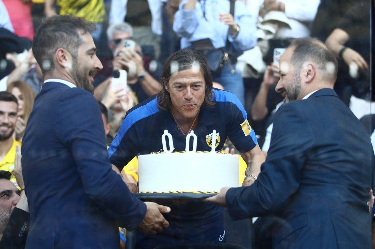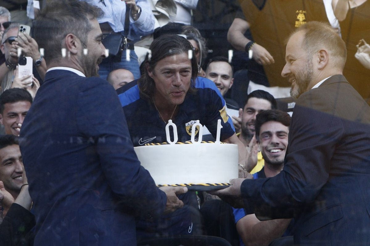 Ο Ματίας Αλμέιδα έσβησε τα κεράκια με τον αριθμό "100" στην τούρτα της ΑΕΚ, σε μια συμβολική κίνηση για την επέτειο των 100 χρόνων ιστορίας των κιτρινόμαυρων.