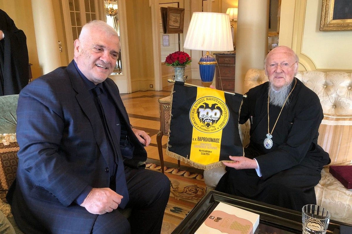Το αφεντικό της κιτρινόμαυρης ΠΑΕ, τίμησε τον οικουμενικό πατριάρχη με το μετάλλιο της τιμής “ο Χρυσός Δικέφαλος Αετός” και το λάβαρο του συλλόγου και τον ενημέρωσε για τους εορτασμούς των 100 ετών, αλλά και για τα δύο μουσεία που συστεγάζονται στο γήπεδο, το Μουσείο Προσφυγικού Ελληνισμού και το Μουσείο Ιστορίας της ΑΕΚ.