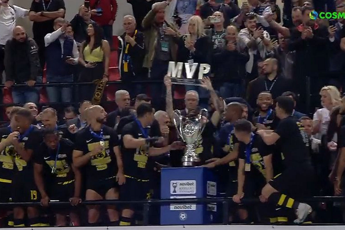 Η ΑΕΚ νίκησε τον ΠΑΟΚ στον τελικό του Κυπέλλου Ελλάδας Novibet 2-0 και πανηγύρισε την κατάκτηση του τρίτου νταμπλ στην ιστορία της. Το βραβείο του MVP κατέκτησε ο Αρόλντ Μουκουντί. Ωστόσο, λίγο πριν από την απονομή, ο Ρότα το… δανείστηκε, τρολάροντας τον εαυτό του για την κόκκινη κάρτα στο 6ο λεπτό.