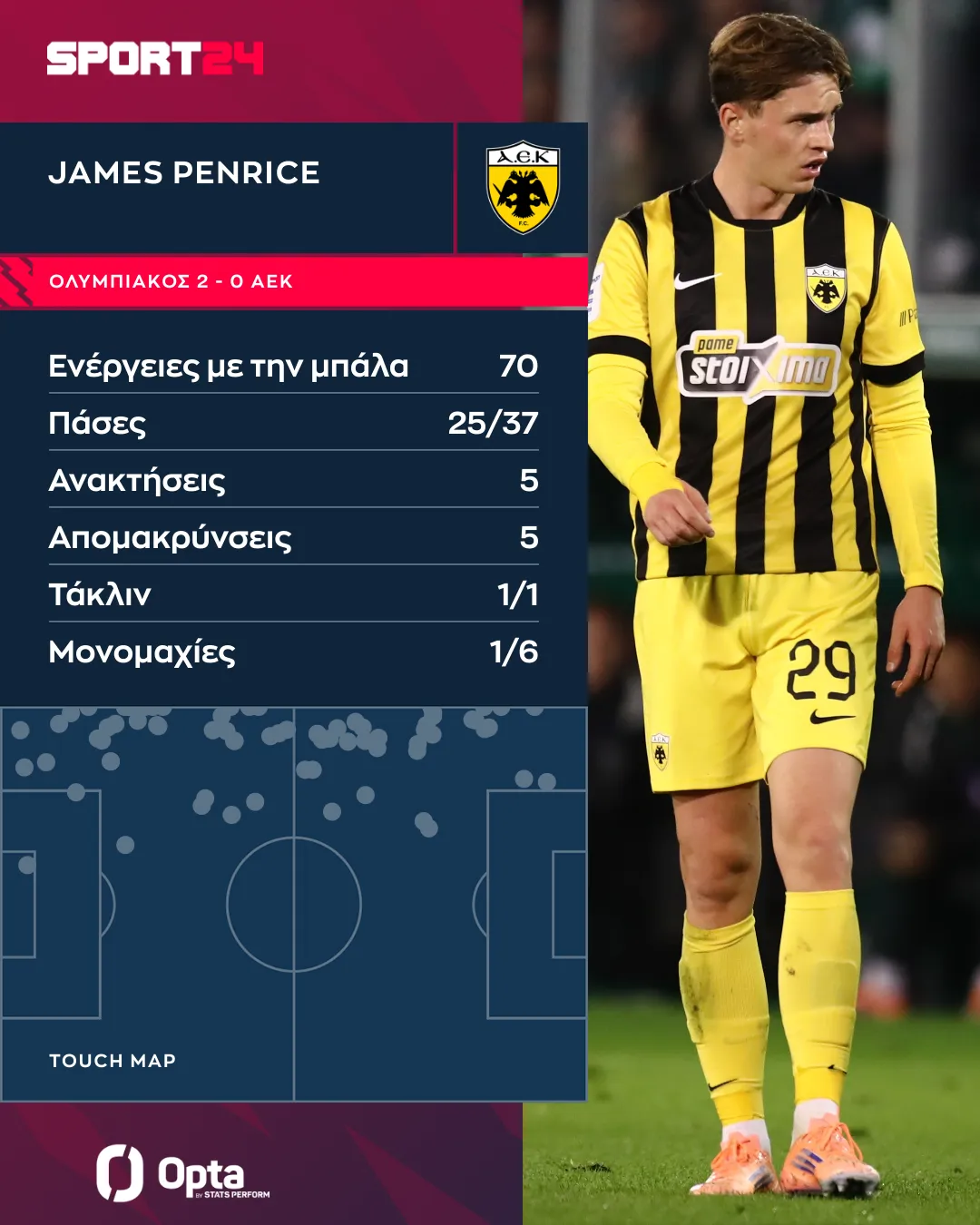 Ο 26χρονος αμυντικός δεν είχε πολύ μεγάλη ακρίβεια στις πάσες του (25/37) ήταν οι επιτυχημένες και δεν απέφυγε τα πολλά λάθη, κυρίως στις μεταβιβάσεις του. Στο ανασταλτικό κομμάτι ο Πενράις απομάκρυνε πέντε φορές την μπάλα και οι δύο εξ αυτών στην περιοχή του Στρακόσα και ανέκτησε την κατοχή της μπάλας πέντε φορές.