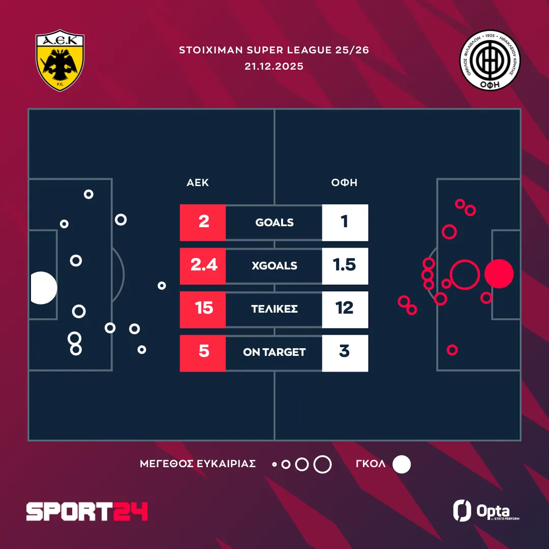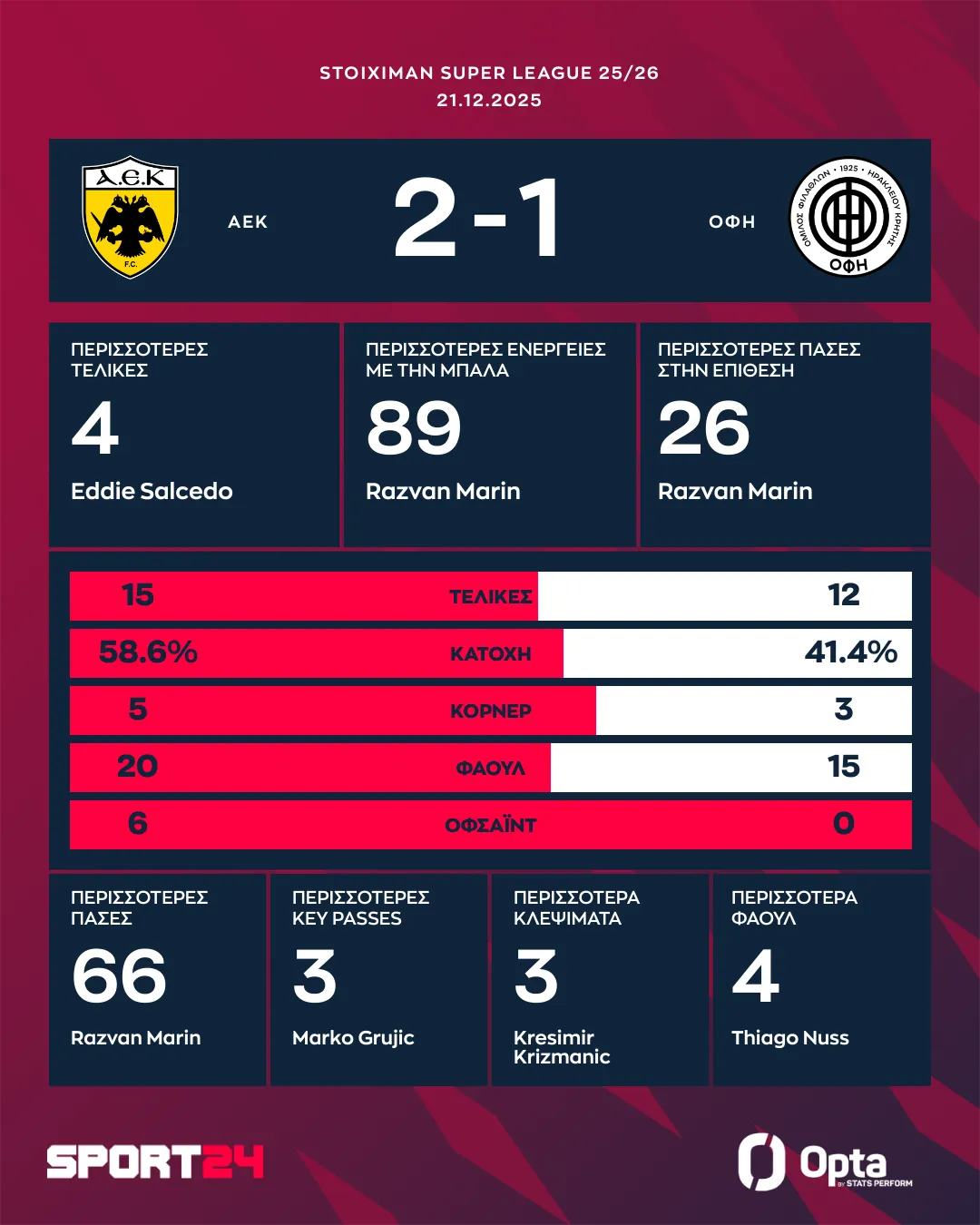 Η ΑΕΚ λύγισε με ανατροπή 2-1 τον ΟΦΗ στην OPAP Arena και σκαρφάλωσαν στην κορυφή της Stoiximan Super League. Οι Κρητικοί προηγήθηκαν με τον Σαλσέδο στο 2′, αλλά η Ένωση το έφερε τούμπα με Λιούμπιτσιτς και Γιόβιτς στο δεύτερο μέρος. Ακυρώθηκαν τρία γκολ των κιτρινόμαυρων, οι φιλοξενούμενοι είχαν δοκάρι με τον Σενγκέλια.