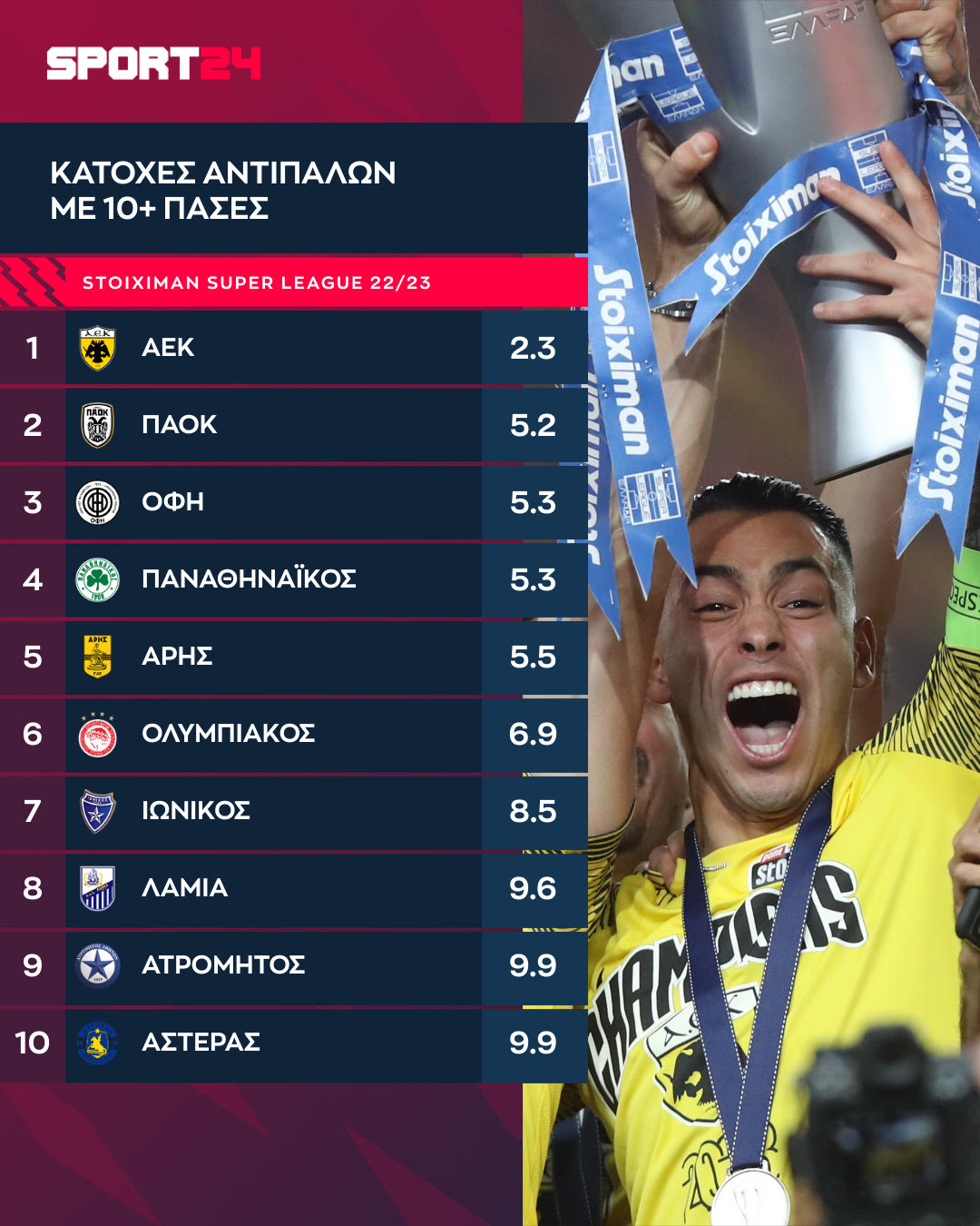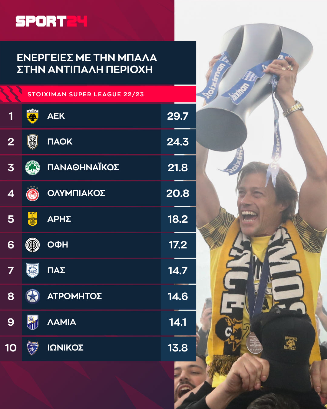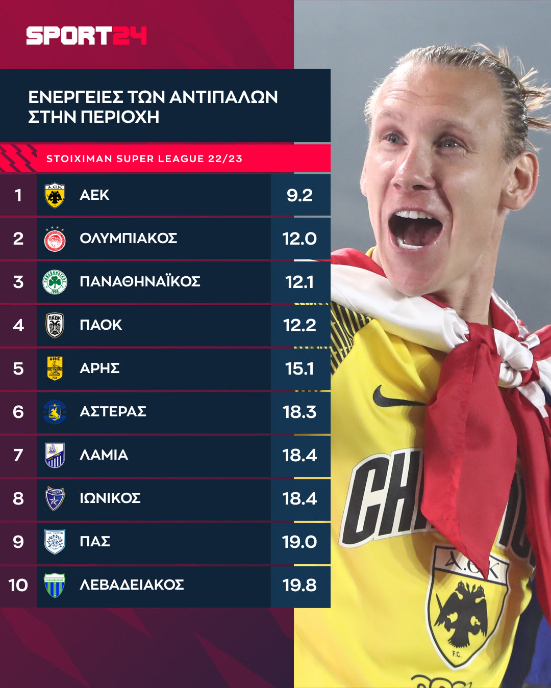 Αντίθετα, δεν επέτρεπε στους αντιπάλους να πατούν τη δική της με την ίδια ευκολία. Η ΑΕΚ έγινε η πρώτη ομάδα που έκλεισε τη σεζόν με μονοψήφιο μέσο όρο ενέργειών στην περιοχή της.
