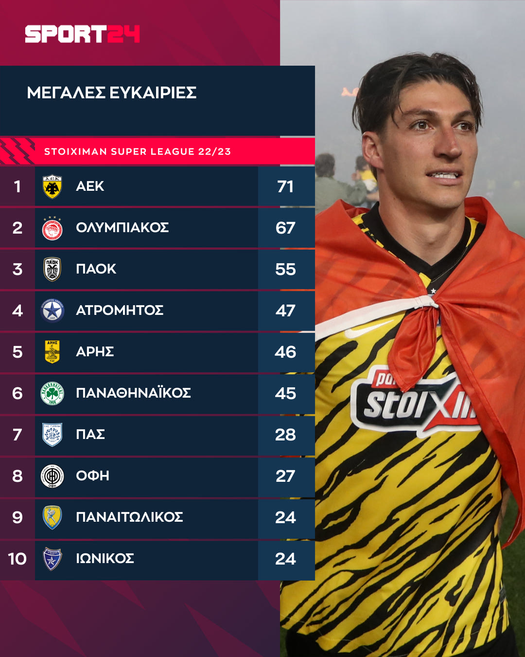 Αντίστοιχα εντυπωσιακά ήταν και τα νούμερά της όσον αφορά στις μεγάλες ευκαιρίες που δημιούργησε τη φετινή σεζόν. Οι “κιτρινόμαυροι” ολοκλήρωσαν τη σεζόν με 71 μεγάλες ευκαιρίες, αφήνοντας στη δεύτερη θέση τον Ολυμπιακό με 67, ενώ τρίτος ήταν ο ΠΑΟΚ με 55.