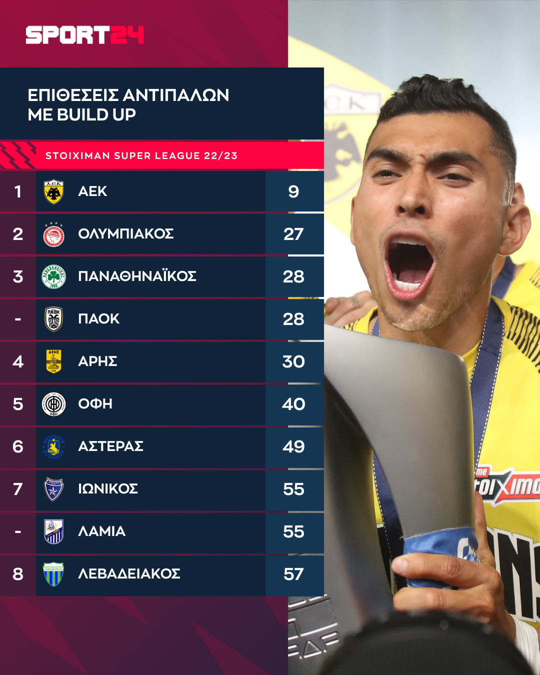Η ΑΕΚ δέχθηκε μόνο εννέα τέτοιες επιθέσεις στο φετινό πρωτάθλημα. Η προηγούμενη τοπ επίδοση ήταν οι 15 επιθέσεις με build up που δέχθηκε ο Ολυμπιακός το 2019-20.