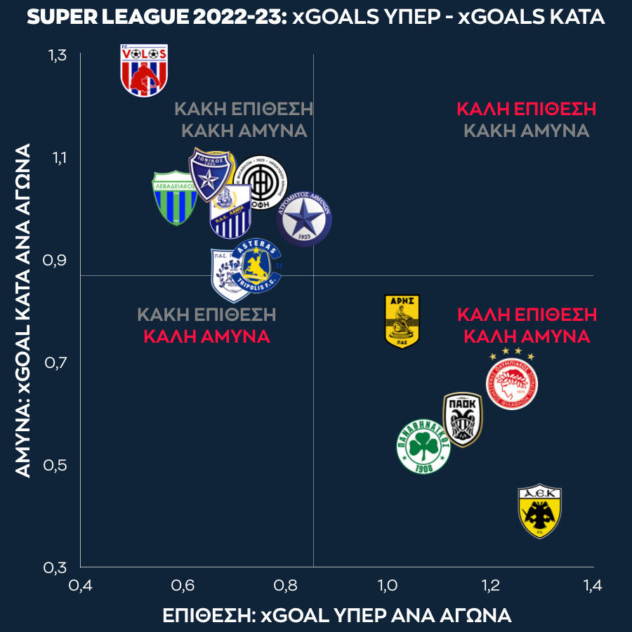 Καταρχάς, η Ένωση ήταν η πιο απειλητική ομάδα του πρωταθλήματος, με 1.30 xGoals ανά αγώνα, μπροστά από το 1.25 που είχε ο Ολυμπιακός. Και μακράν η καλύτερη αμυντική λειτουργία: η ΑΕΚ δέχθηκε μόλις 0.41 xG ανά αγώνα, επίδοση πολύ μπροστά από το εξαιρετικό 0.53 του Παναθηναϊκού.