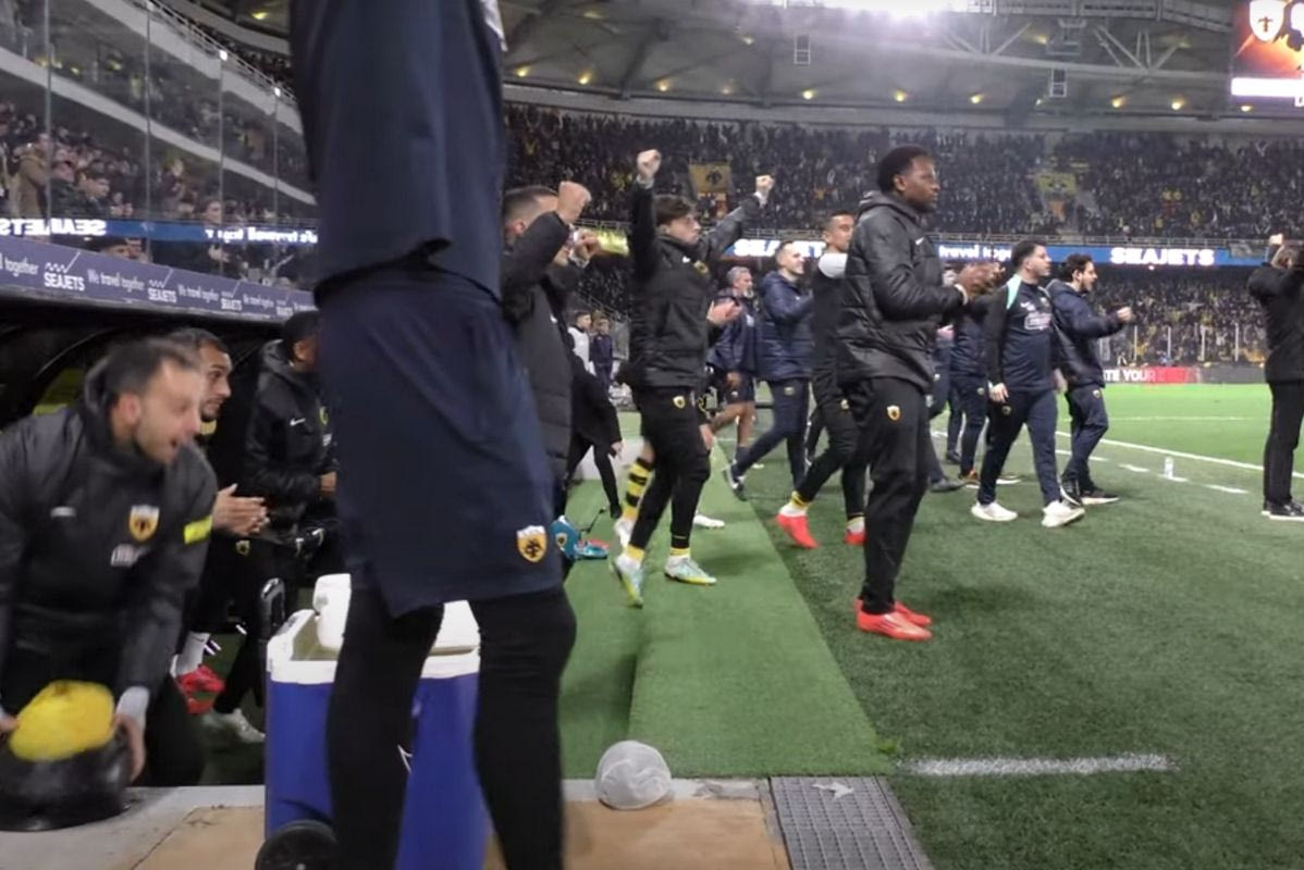 ΑΕΚ: Οι αντιδράσεις του πάγκου στα γκολ, και η αριστοτεχνική εκτέλεση φάουλ του Λαμέλα από άλλη λήψη