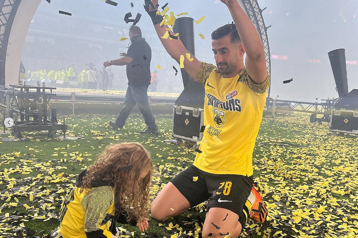 Μετά την απονομή του πρωταθλήματος της ΑΕΚ, ο Εχσάν Χατζισαφί χαρούμενος για την κατάκτηση του τίτλου πανηγύριζε έχοντας αγκαλιά την κόρη του.