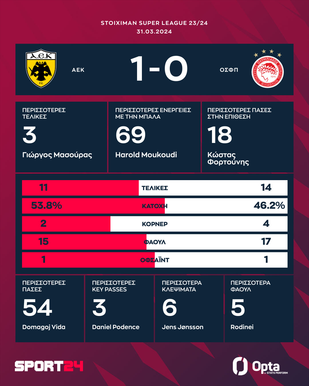 Η ΑΕΚ με αυτούς τους τρεις βαθμούς ανέβηκε στους 65 και είναι στο +2 από τον ΠΑΟΚ, ενώ ο Ολυμπιακός παρέμεινε τέταρτος με 57 βαθμούς.