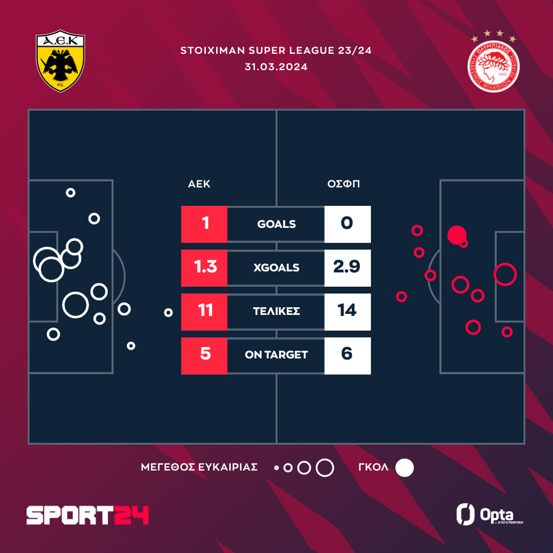 Ο Ολυμπιακός ήταν αυτός που είχε τις καλύτερες φάσεις στο ματς, όμως ο Αθανασιάδης ήταν εκεί όπου χρειάστηκε. Η ΑΕΚ είχε κι αυτή τις ευκαιρίες της (και ένα ακυρωθέν γκολ του Άμραμπατ), αλλά μέχρι το φινάλε κανείς τους δεν μπόρεσε να βρει το γκολ.