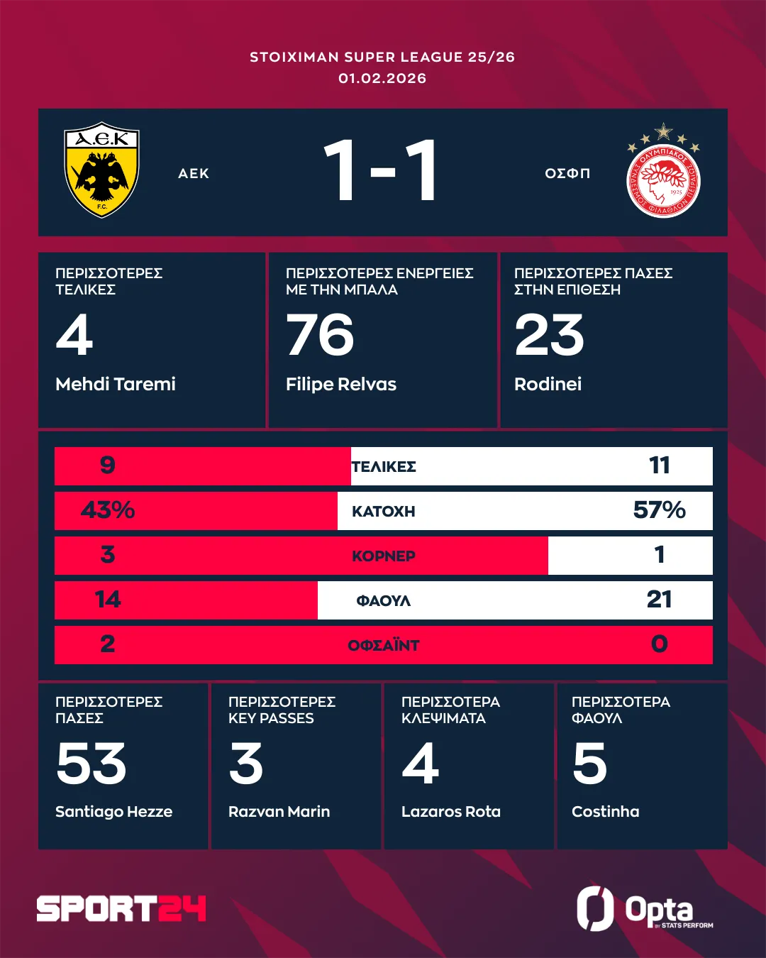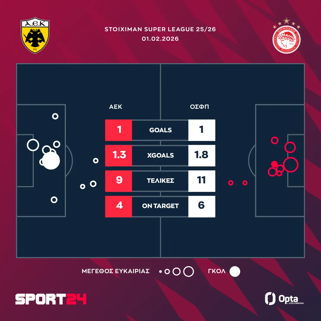 Η ΑΕΚ κρατούσε τη νίκη στα χέρια της, αλλά ο Ολυμπιακός έφυγε όρθιος από την Allwyn Arena. Η Ένωση προηγήθηκε με την κεφαλιά του Βάργκα στο 59′, αλλά οι ερυθρόλευκοι έσωσαν την παρτίδα με το εύστοχο χτύπημα πέναλτι του Ταρέμι στο 105′.