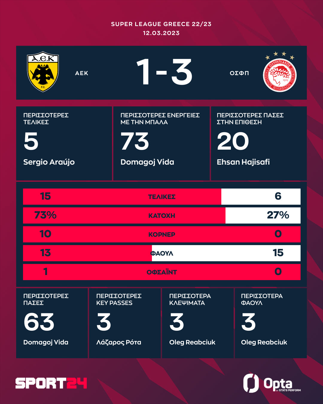 Ο Ολυμπιακός υποχρέωσε την ΑΕΚ στην πρώτη της ήττα στην OPAP Arena, ήταν καταιγιστικός στο β' μέρος, επικράτησε 3-1 της Ένωσης και έχει βάλει φωτιά στο πρωτάθλημα ενόψει των playoffs. Ο Μουκουντί έβαλε αυτογκόλ στο 50', Μπακαμπού (53') και Κανός (67') ανέβασαν τον δείκτη του σκορ και ο Τσούμπερ μείωσε (81').