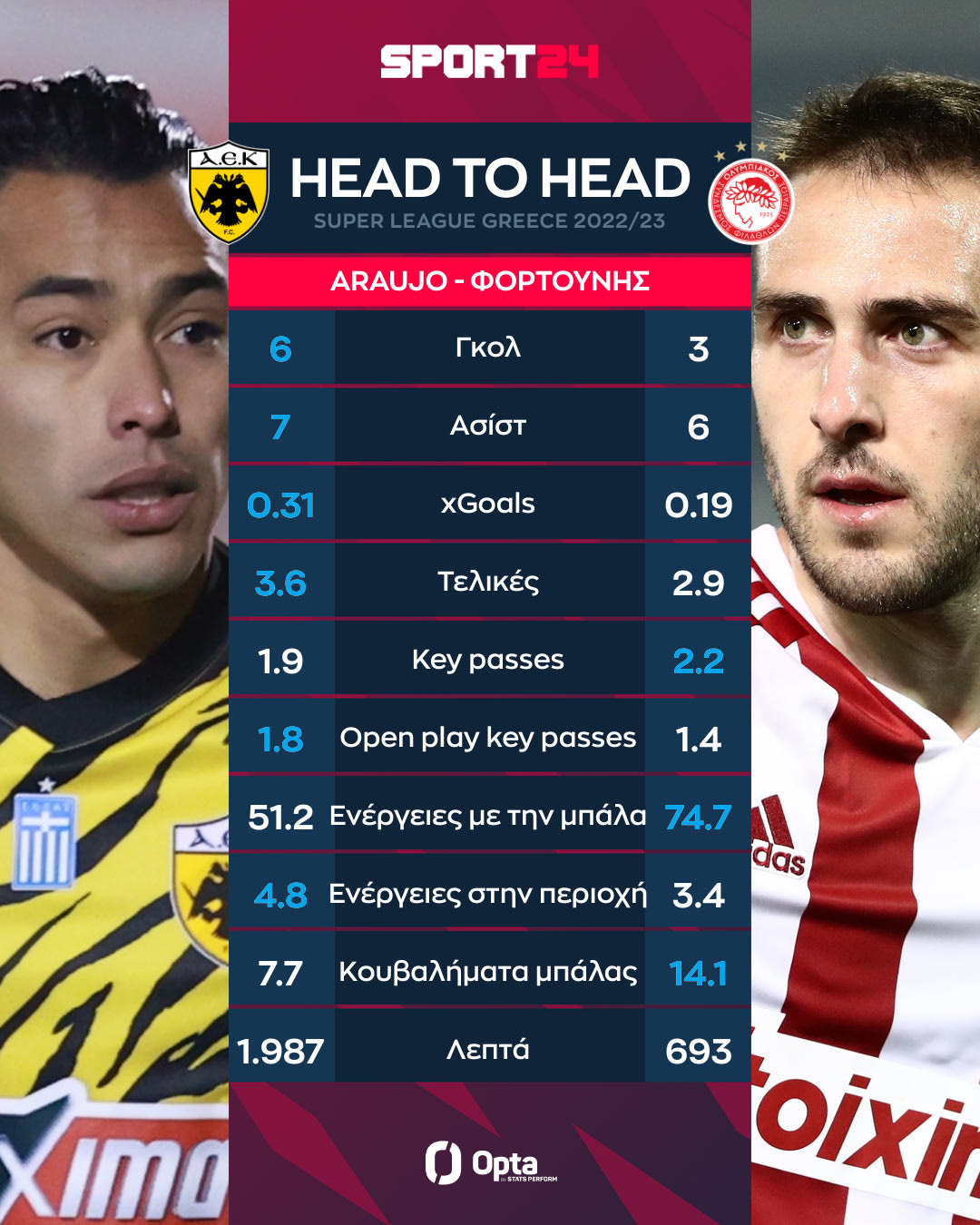 Ο Αραούχο και ο Φορτούνης έχουν όλα τα φόντα για να πρωταγωνιστήσουν στο ντέρμπι. Στο infographic μπορείτε να δείτε την σύγκριση των δύο ποδοσφαιριστών. Με γαλάζιο χρώμα είναι ο παίκτης με την καλύτερη επίδοση σε κάθε κατηγορία.