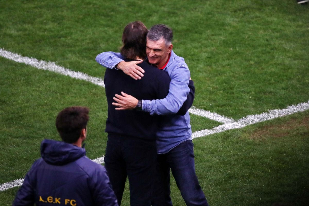 Μετά το τελευταίο σφύριγμα στο “Γ. Καραϊσκάκης” και παρά την ιστορική νίκη (6-0) του Ολυμπιακού απέναντι στην ΑΕΚ, η μεγαλύτερη σε έκταση των ερυθρόλευκων κόντρα στην Ένωση στον θεσμό του Κυπέλλου Ελλάδας, οι δύο προπονητές πλησίασαν ο ένας τον άλλον και αντί της κλασικής χειραψίας έκαναν μία αγκαλιά.