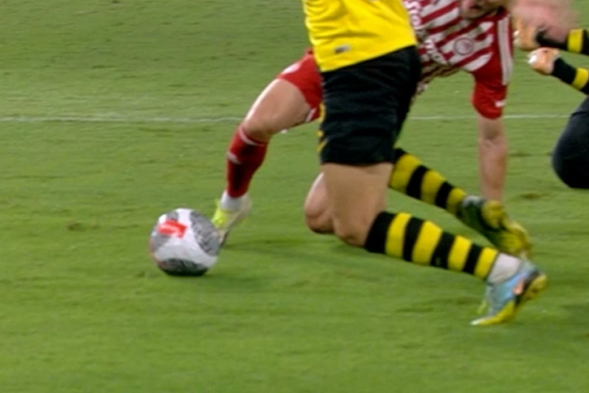 ΑΕΚ – Ολυμπιακός: Η Ένωση κέρδισε πέναλτι για μαρκάρισμα του Κίνι στον Ρότα, ο διαιτητής το πήρε πίσω μέσω VAR