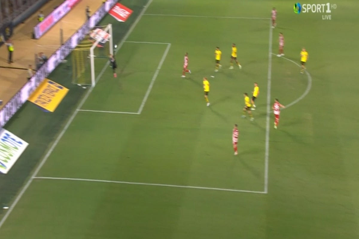 Τότε που ο Φορτούνης έδωσε την πάσα στον Μασούρα, εκείνος έκανε το σουτ αριστερά εκτός περιοχής με το αριστερό και ο Στάνκοβιτς έδιωξε σε κόρνερ.