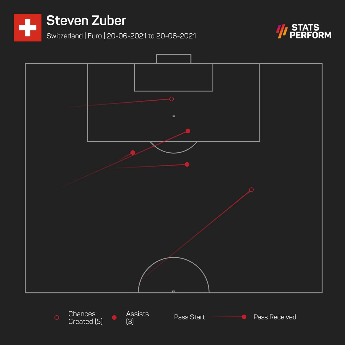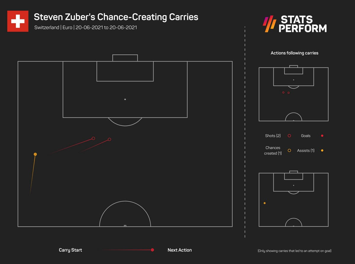 Ο Στίβεν Ζούμπερ δημιούργησε συνολικά 5 ευκαιρίες, οι 3 εξ αυτών οδήγησαν και στα τρία γκολ που πέτυχαν οι Ελβετοί. Στο σχετικό γράφημα της Opta / Stats Perform μπορείτε να δείτε τα σημεία απ’ τα οποία ο 29χρονος μέσος έβγαλε τις ασίστ σε Σεφέροβιτς και Σακίρι.