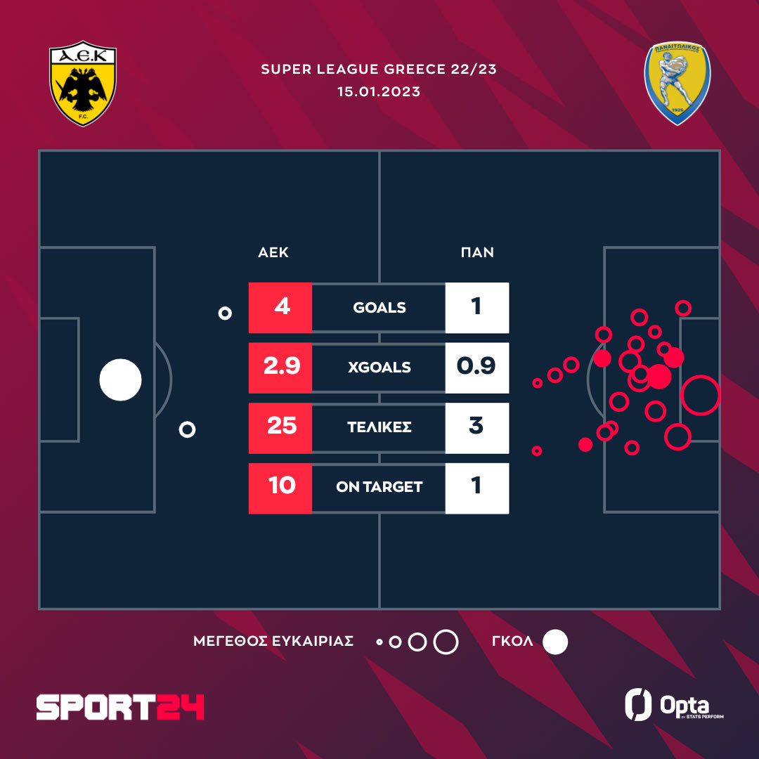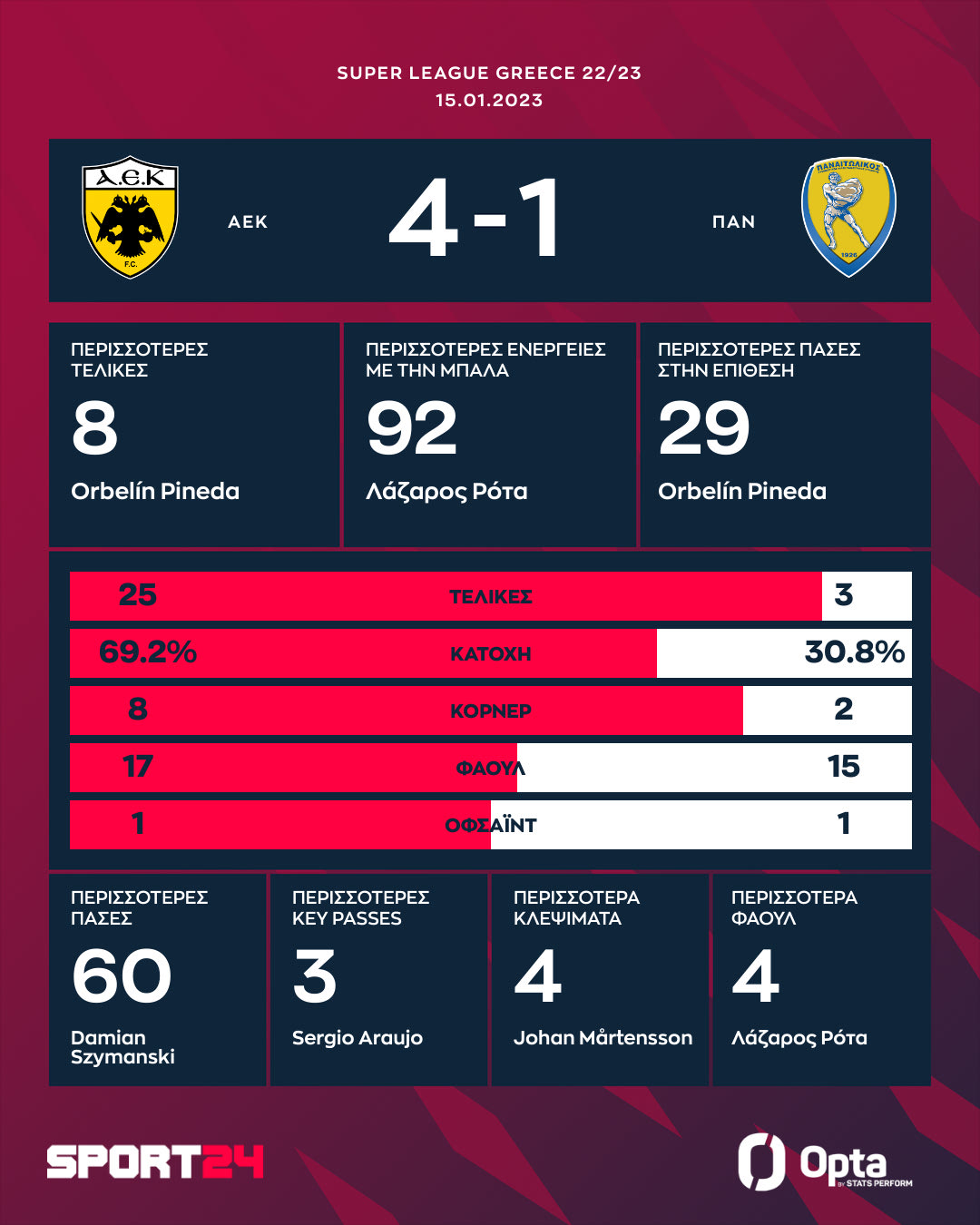 Η ΑΕΚ προσέφερε μια ακόμα μαγική παράσταση στην OPAP Arena και… ισοπέδωσε τον Παναιτωλικό, επικρατώντας 4-1 για τη 18η αγωνιστική της Super League. Οι σκόρερ για την ομάδα του Ματίας Αλμέιδα ήταν οι Αραούχο, Γκαρσία, Πινέδα και Άμραμπατ, δηλαδή όλοι οι παίκτες της μεσοεπιθετικής γραμμής. Ο Παναιτωλικός μείωσε απλά σε 2-1 στο 39ο λεπτό με το εύστοχο χτύπημα πέναλτι του Ζοάο Πέδρο.
