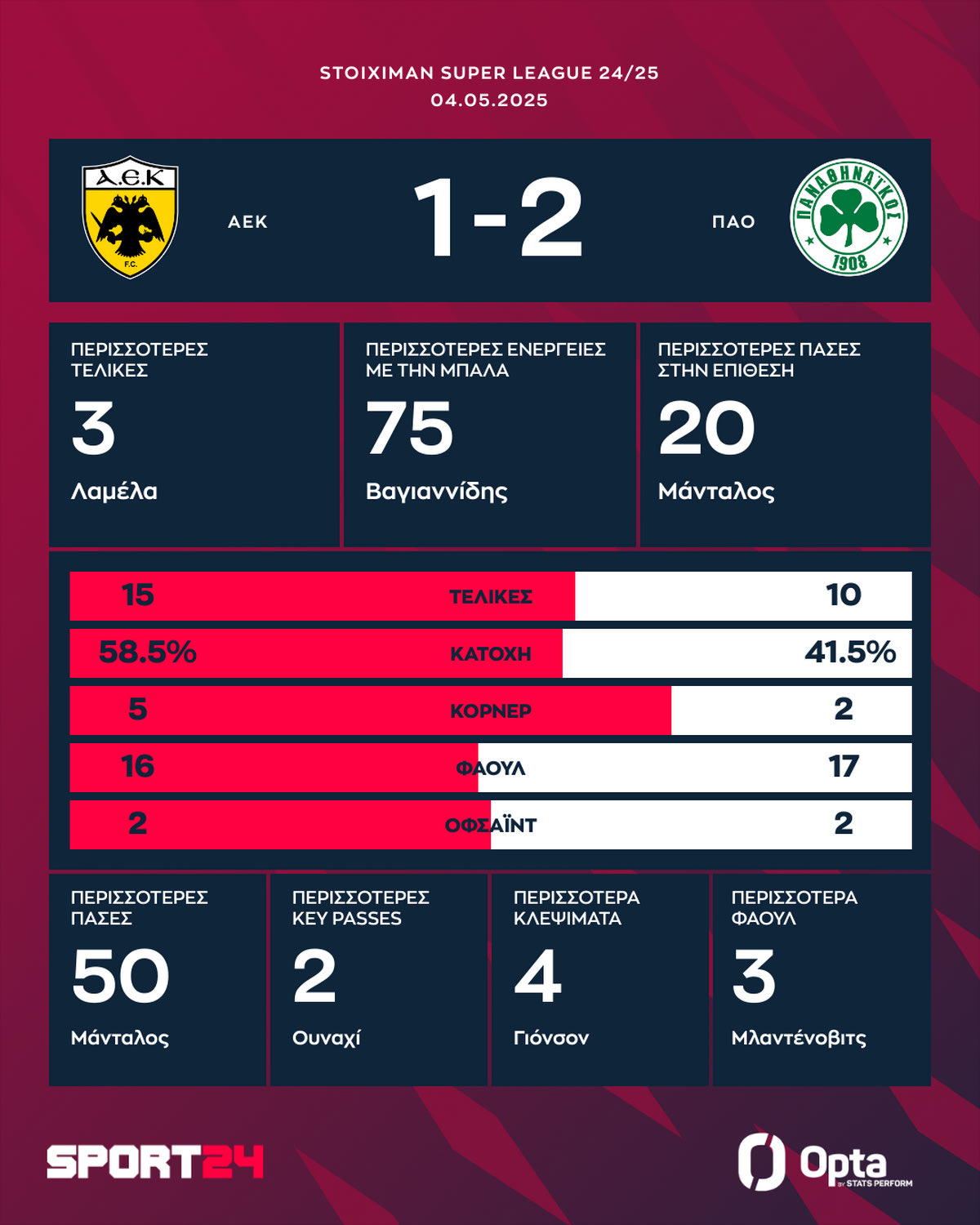 Το διπλό μετά από τέσσερις μήνες για τον Παναθηναϊκό ήρθε στο κατάλληλο σημείο, καθώς νίκησε την ΑΕΚ με 2-1 στην OPAP Arena και τερμάτισε και μαθηματικά στη 2η θέση των playoffs της Stoiximan Super League. Δεν σηκώνει κεφάλι η Ένωση, που δέχθηκε την πέμπτη της ήττα σε ισάριθμα ματς στο μίνι πρωτάθλημα.