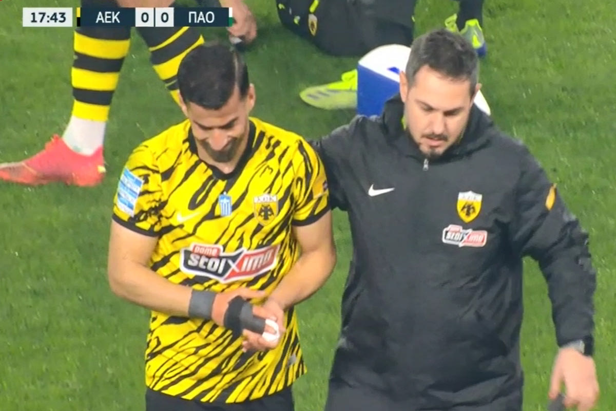 Ο Εχσάν Χατζισαφί συνέχισε το ντέρμπι με ράμματα και δεμένο το δεξί του χέρι κοντά στον καρπό. Ο Ιρανός μπακ έπεσε άτσαλα μετά από εναέρια μονομαχία με τον Παλάσιος, του σκίστηκε το χέρι και το ιατρικό επιτελείο της ΑΕΚ του έκανε ράμματα για να μπορέσει να συνεχίσει το ματς.