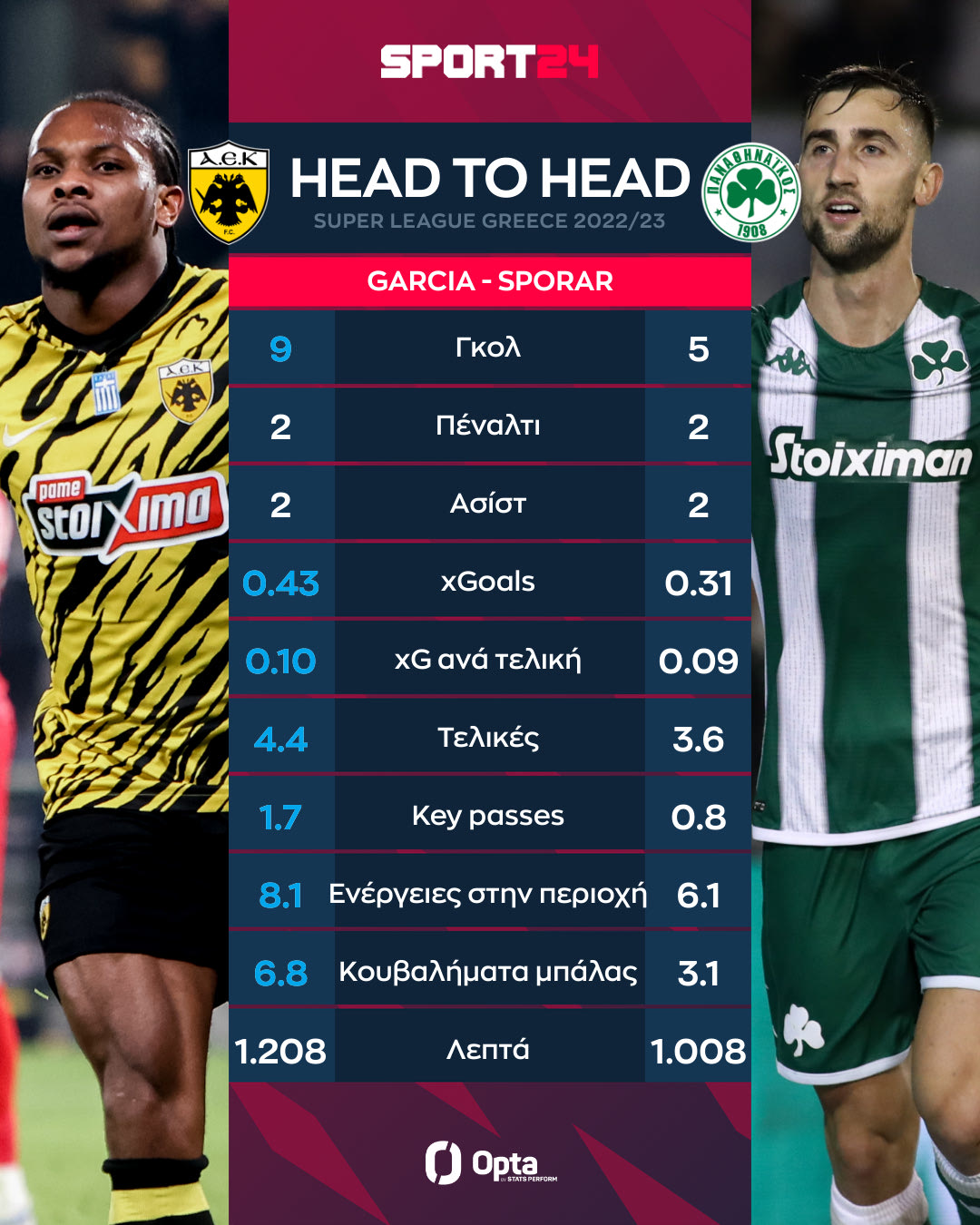 Πάμε, όμως, να δούμε και τον συγκριτικό πίνακα με τα κατορθώματα των δύο παικτών. Όπως είναι εμφανές, ο Γκαρσία υπερτερεί σε όλες τις στατιστικές κατηγορίες, επιβεβαιώνοντας πως κάνει σεζόν καριέρας. Η διαφορά σε κάποιες κατηγορίες είναι οριακή, αλλά σε κάποιες άλλες ξεκάθαρη. Το εντυπωσιακό με τον επιθετικό της ΑΕΚ είναι πως βρίσκεται πολύ ψηλά και σε δημιουργία, έχοντας 1.7 key passes ανά 90′, την στιγμή που ο Σπόραρ έχει 0.8.