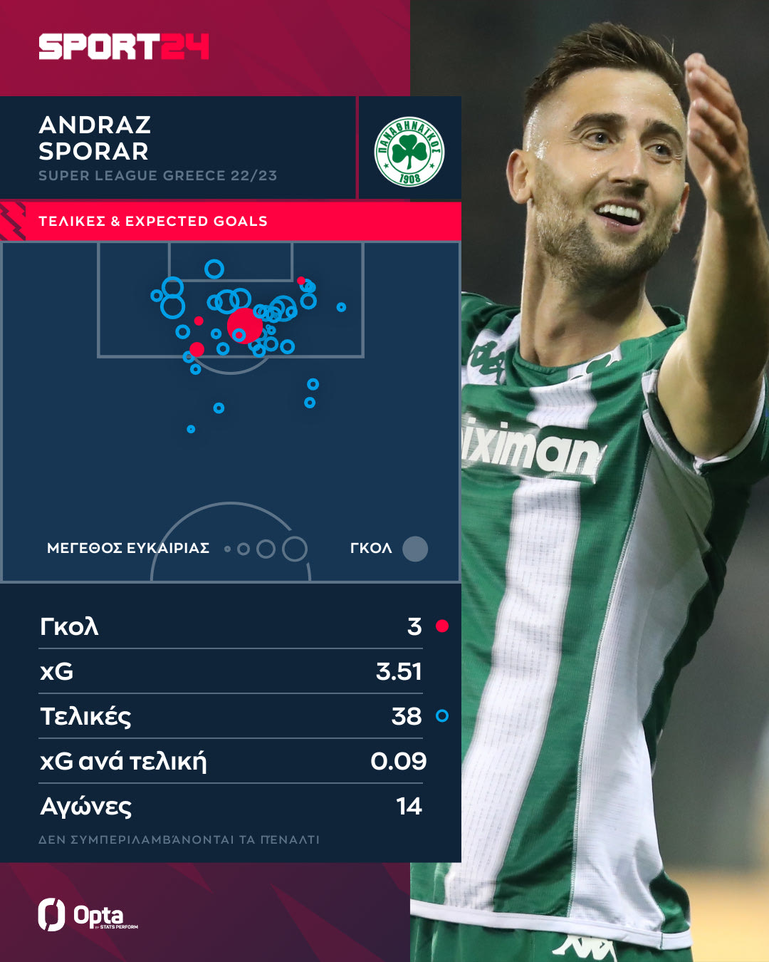 Από την άλλη πλευρά, ο Παναθηναϊκός αναζητούσε εδώ κι αρκετό χρόνια έναν παίκτη για την κορυφή της επίθεσης που θα προσφέρει σημαντικές βοήθειες στο σκοράρισμα, αλλά και γενικότερα στη σωστή επιθετική λειτουργία. Κι η αλήθεια είναι πως στο πρόσωπο του Άντραζ Σπόραρ ο Ιβάν Γιοβάνοβιτς έχει βρει μία αξιόλογη επιλογή, με μεγάλη ποιότητα που γεμίζει την περιοχή, όπως φαίνεται και στο γράφημα της Opta/Stats Perform με τις τελικές του
