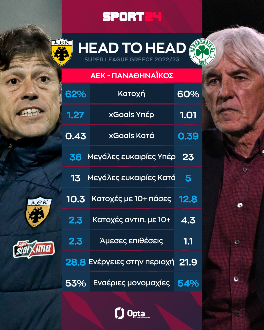 Η ΑΕΚ είναι μπροστά στις περισσότερες κατηγορίες, αλλά ο Παναθηναϊκός έχει ως όπλο του την αμυντική του λειτουργία. Το SPORT24 αναλύει με τα στοιχεία της Opta το ντέρμπι της "OPAP Arena" που μπορεί να κρίνει το φετινό πρωτάθλημα.