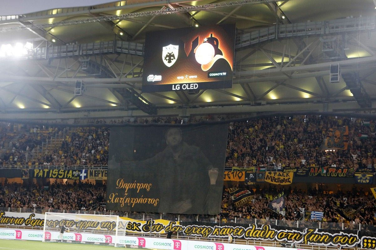 Οι φίλαθλοι της ΑΕΚ τίμησαν τη μνήμη του ιστορικού αρχηγού της Original 21, Δημήτρη Χατζηχρήστου, με ένα μεγάλο πανό στις κερκίδες πριν την έναρξης της αναμέτρησης με την Χάποελ Μπερ Σεβά.