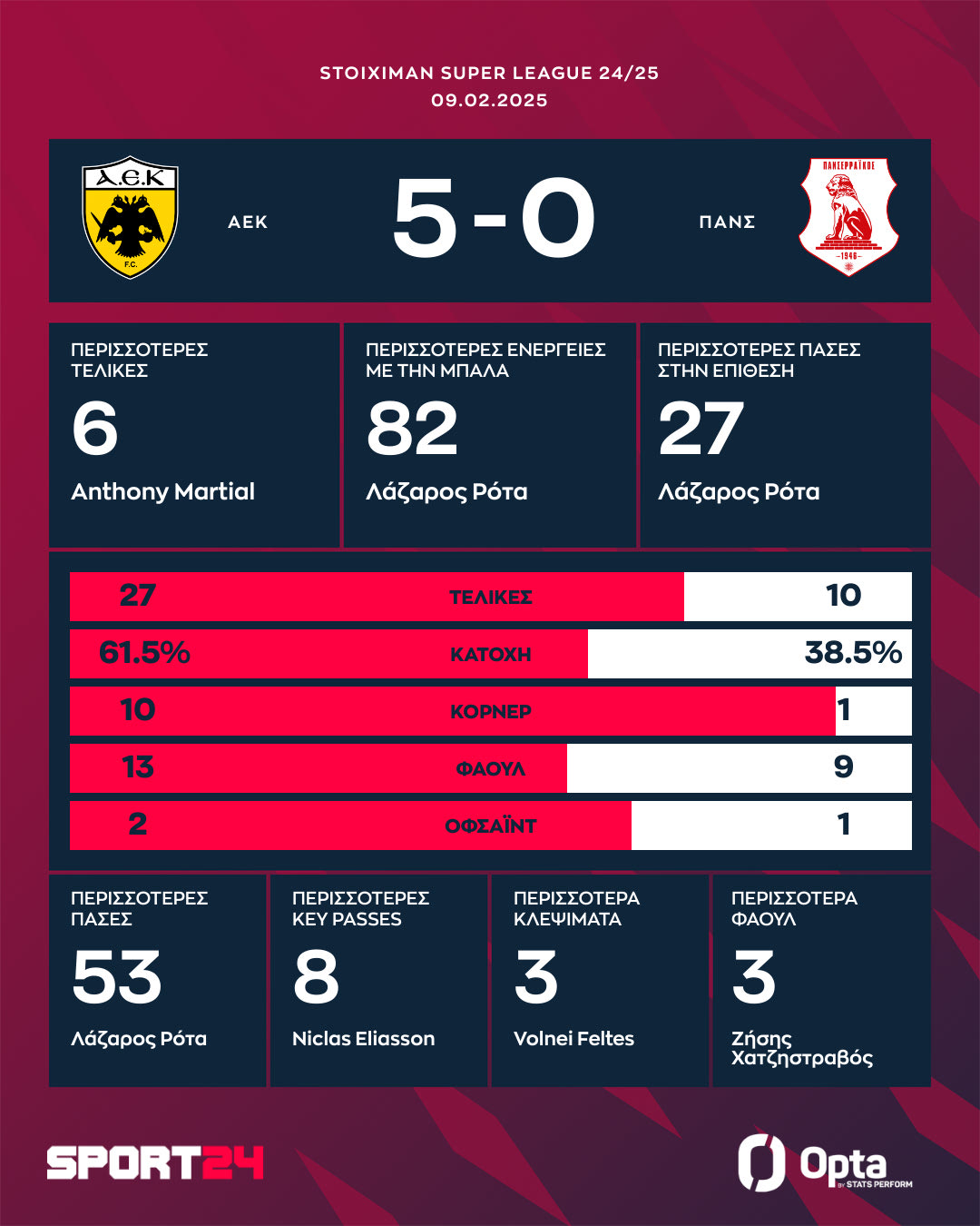 Η ΑΕΚ με αυτό το τρίποντο ανέβηκε στους 46 βαθμούς και είναι στο -2 από τον Ολυμπιακό που έχασε βαθμούς με τον Αστέρα AKTOR.