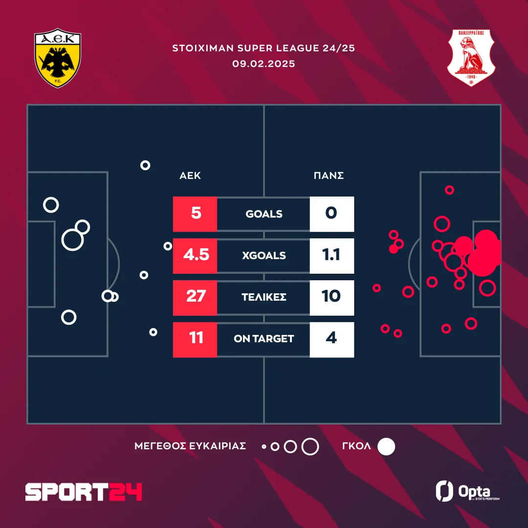 Η ΑΕΚ είχε κέφια, αν και δεν είχε θεατές, καθώς επικράτησε του Πανσερραϊκού 5-0 και ξόρκισε τα μάγια κόντρα στα λιοντάρια που δεν μπόρεσε να νικήσει τις προηγούμενες τρεις φορές που μονομάχησαν. Αντονί Μαρσιάλ και Ρόμπερτ Λιούμπιτσιτς πέτυχαν από δύο γκολ για την ομάδα του Ματίας Αλμέιδα, με τον Ορμπελίν Πινέδα να ανοίγει το σκορ στο όγδοο λεπτό.